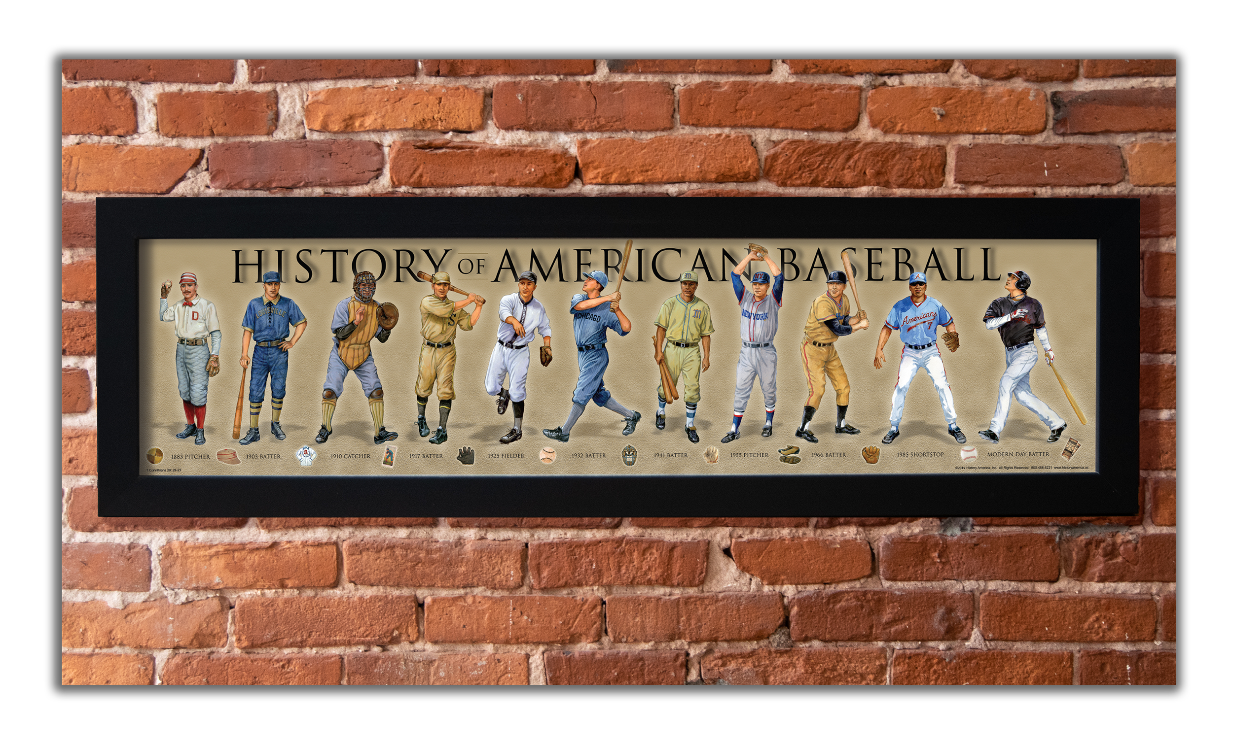Celebrate America's Past time, from the 1800's to modern day. Players from left to right include: 1885 Pitcher, 1903 Batter, 1910 Catcher, 1917 Batter, 1925 Fielder, 1932 Batter, 1941 Batter, 1955 Pitcher, 1966 Batter, 1985 Shortstop, Modern Day Batter. The time-line has 12 iconic baseball images from 1880s to modern day.
