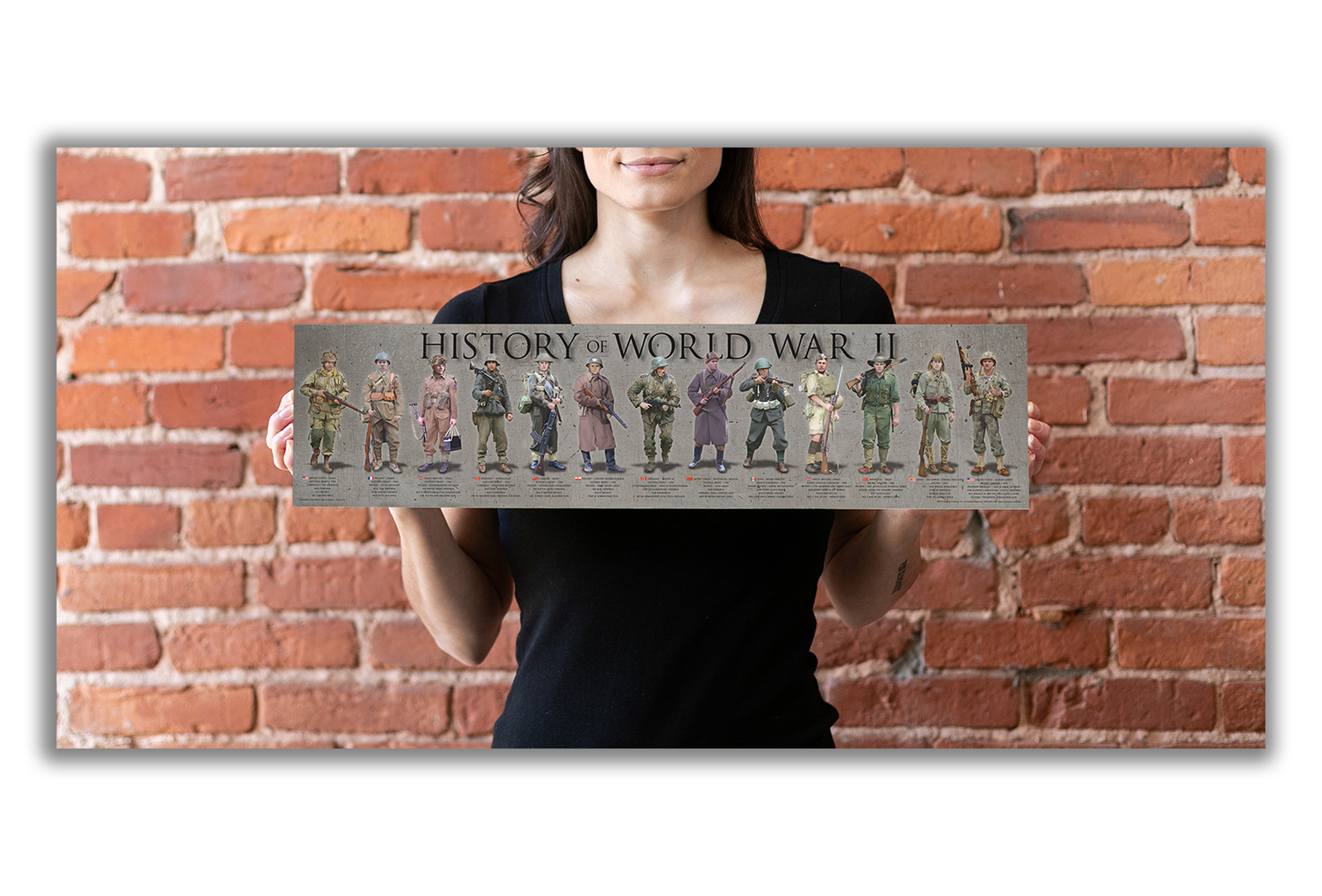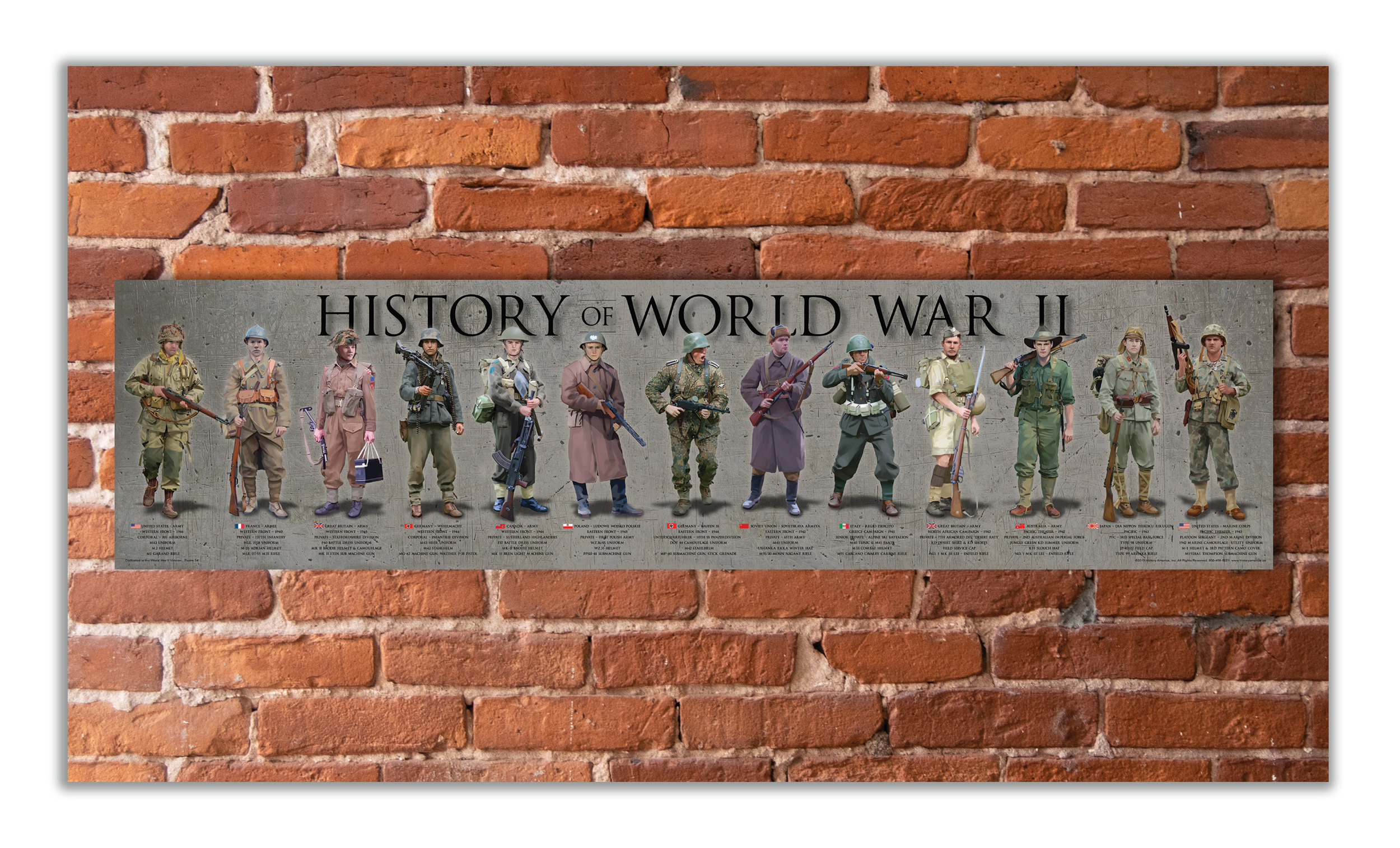 History of World War II - From the invasion of Poland to Japan’s surrender, learn about the world’s deadliest war. The thirteen soldiers represent ten countries, including: the United States, France, Great Britain, Germany, Canada, Poland, the Soviet Union, Italy, Australia, and Japan. Beneath each soldier is their country’s flag, rank, uniform, conflict, and weapon(s).
