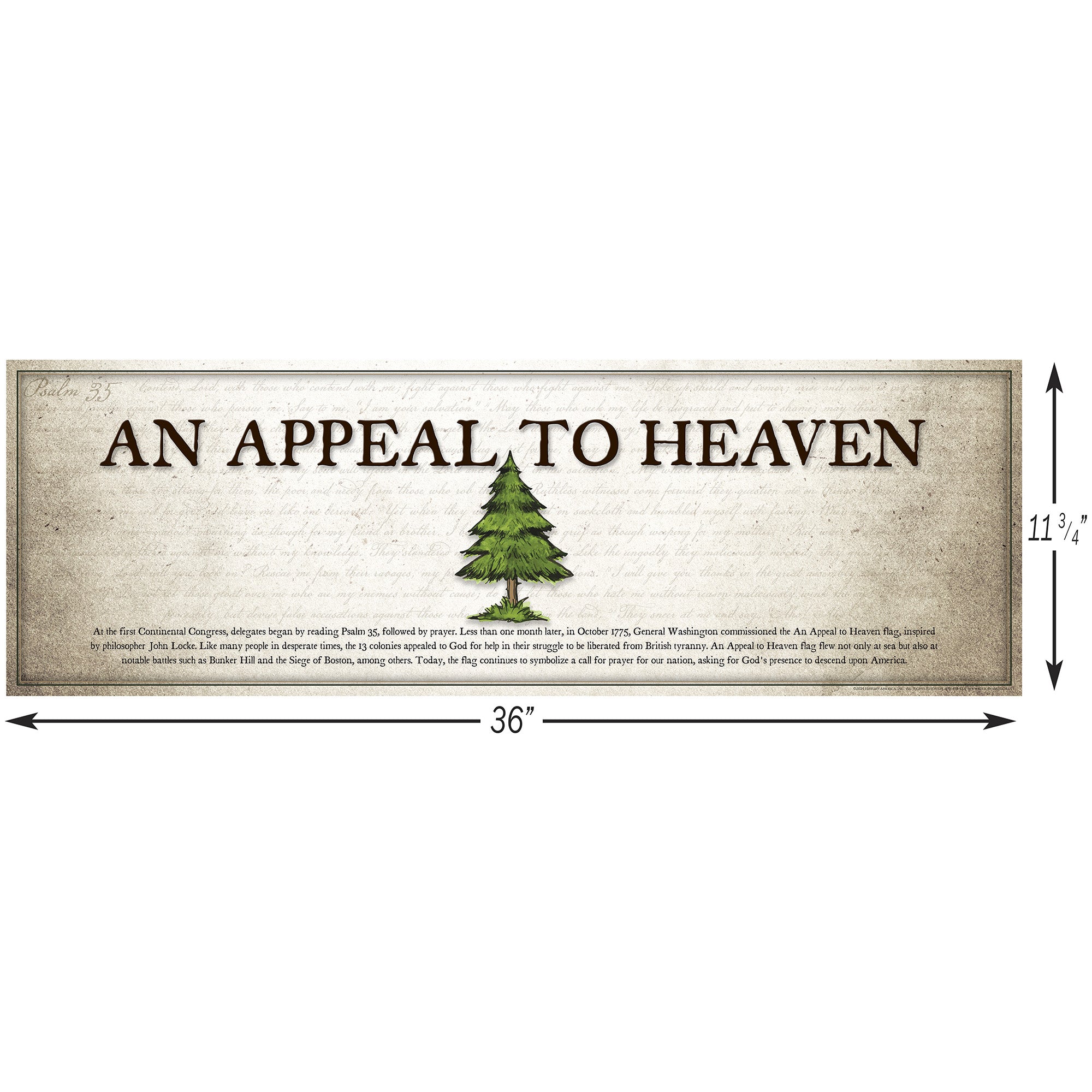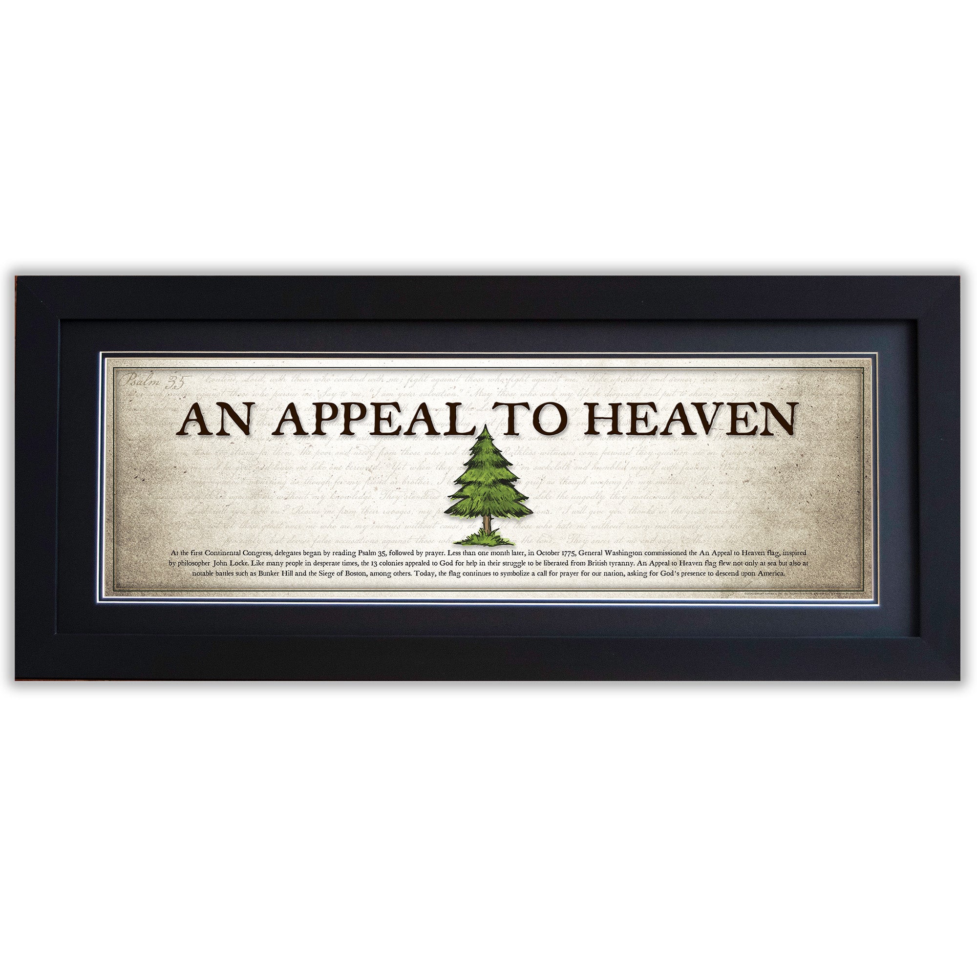 One of America's first unofficial flags during the Revolutionary War was the An Appeal to Heaven flag, inspired by the writings of John Locke. This banner, which boldly proclaimed "An Appeal to Heaven," flew during some of the nation's earliest battles, including the Battle of Bunker Hill and the Battle of Boston. The background behind the iconic pine tree and inscription lies Psalm 35, which was read at the First Continental Congress. Today, we once again make an appeal to Heaven, seeking God's grace and presence upon America.