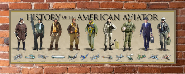 Celebrate America’s proud aviation heritage, from the pioneering days of the early 1900s to today’s modern pilot. The nine aviators include: World War I-era Pilot, 1920s Female Pilot, World War II Fighter Pilot, World War II Bomber Pilot, Korean War Fighter Pilot, 1960s Test Pilot, Vietnam War Fighter Pilot, Commercial Pilot, and a Modern-Day Fighter Pilot. The timeline showcases iconic American-made and operated aircraft, representing both civilian and military aviation.