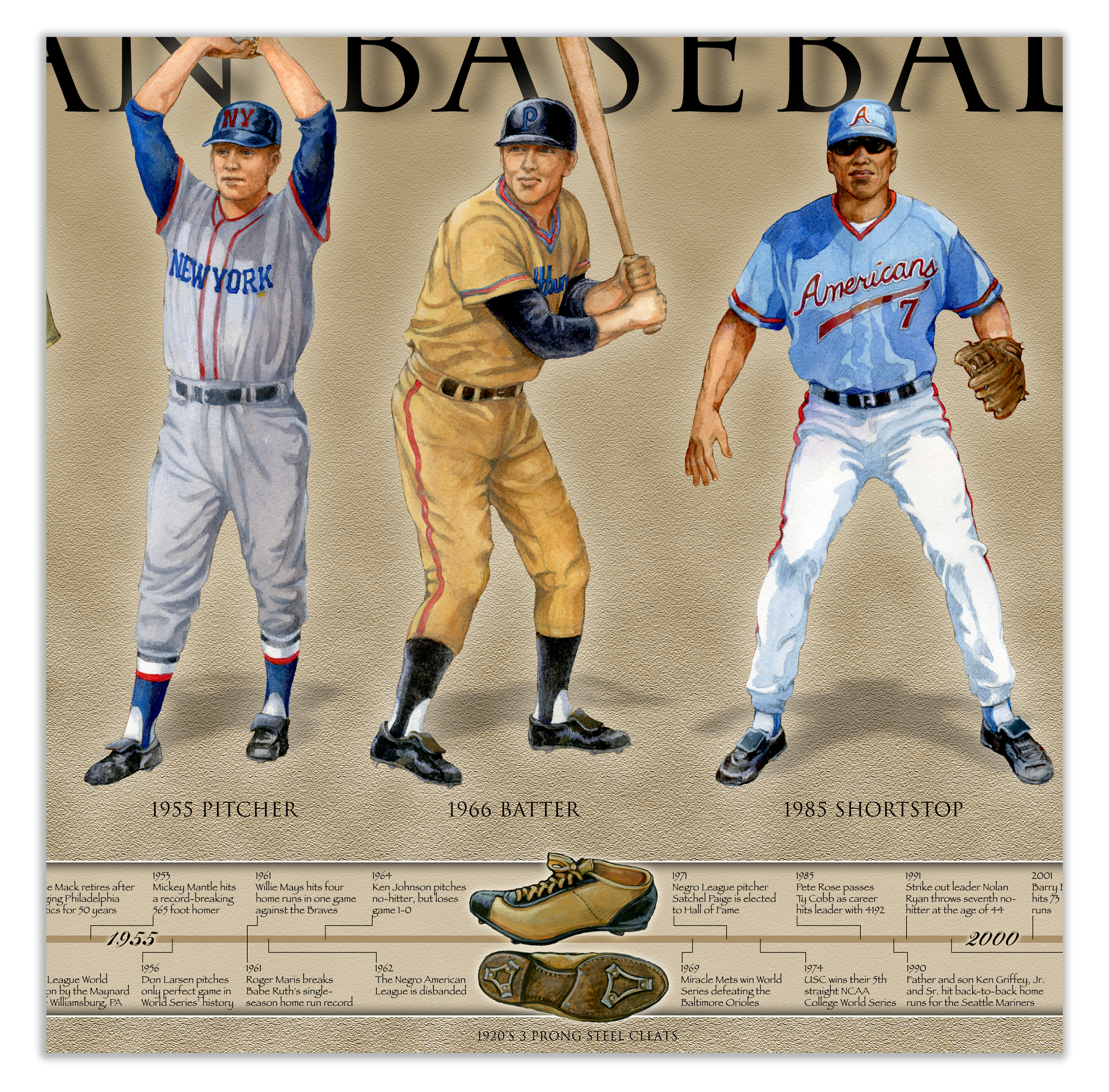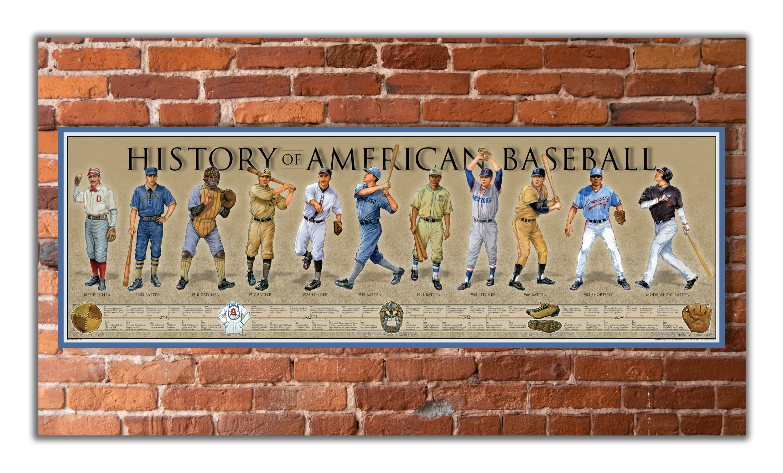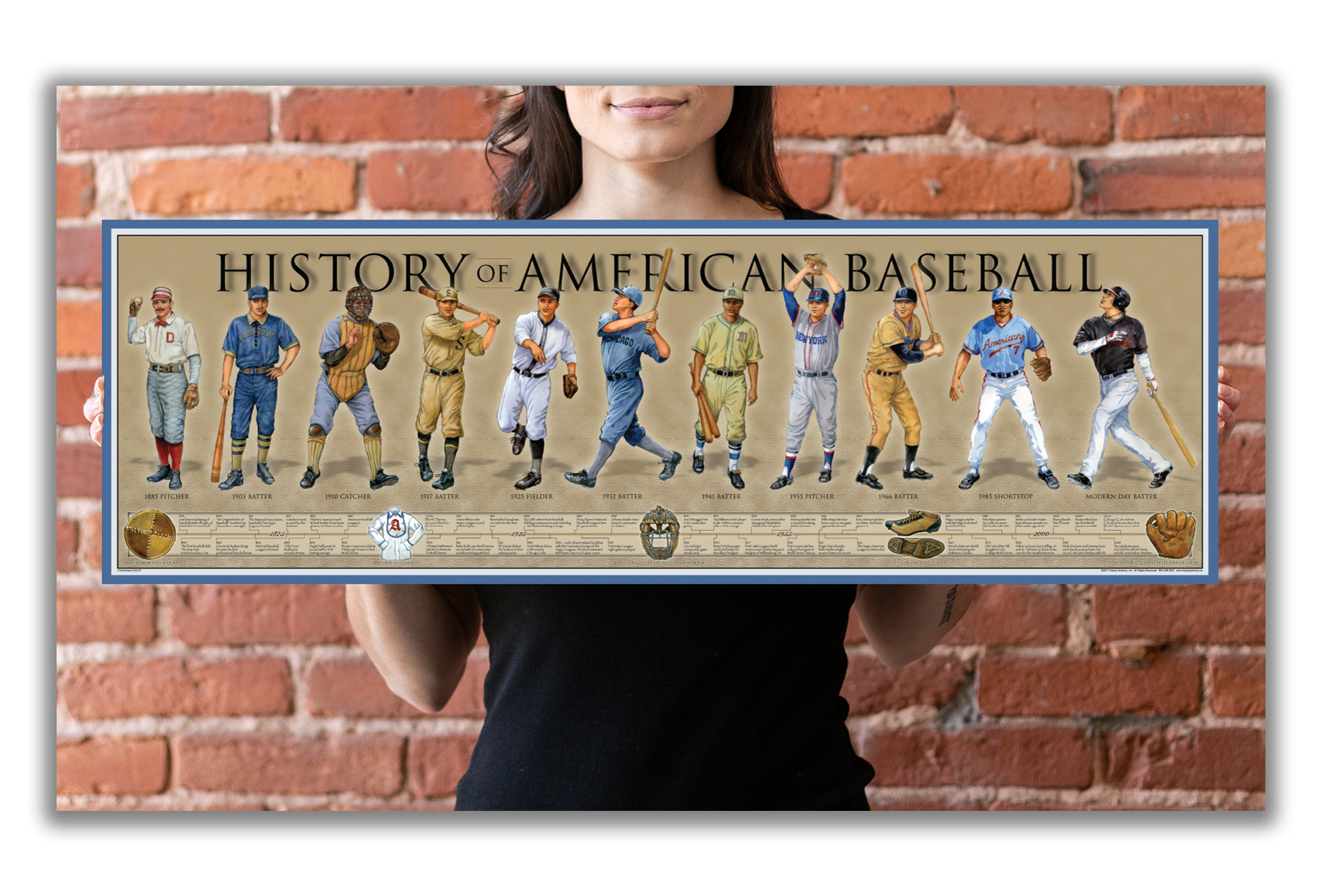 Celebrate America's Past time, from the 1800's to modern day. Players from left to right include: 1885 Pitcher, 1903 Batter, 1910 Catcher, 1917 Batter, 1925 Fielder, 1932 Batter, 1941 Batter, 1955 Pitcher, 1966 Batter, 1985 Shortstop, Modern Day Batter. The 47 point time-line includes dates, facts and 5 vintage pieces of equipment.
