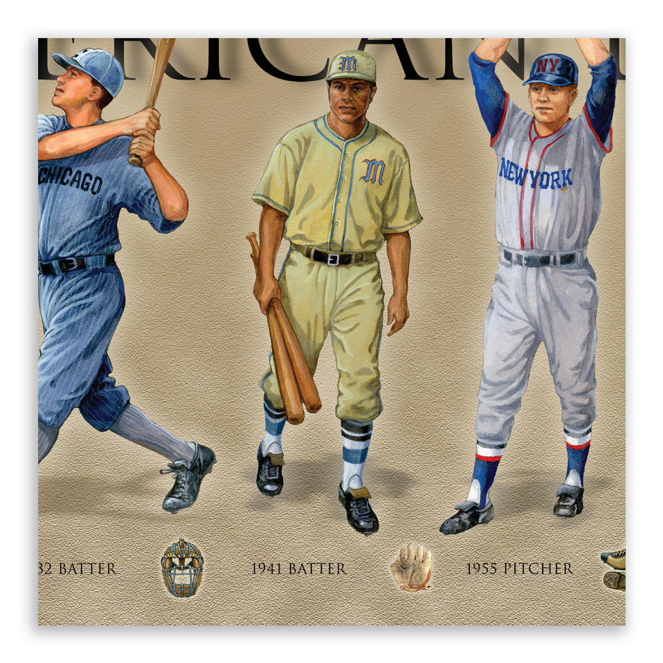 Celebrate America's Past time, from the 1800's to modern day. Players from left to right include: 1885 Pitcher, 1903 Batter, 1910 Catcher, 1917 Batter, 1925 Fielder, 1932 Batter, 1941 Batter, 1955 Pitcher, 1966 Batter, 1985 Shortstop, Modern Day Batter. The time-line has 12 iconic baseball images from 1880s to modern day.