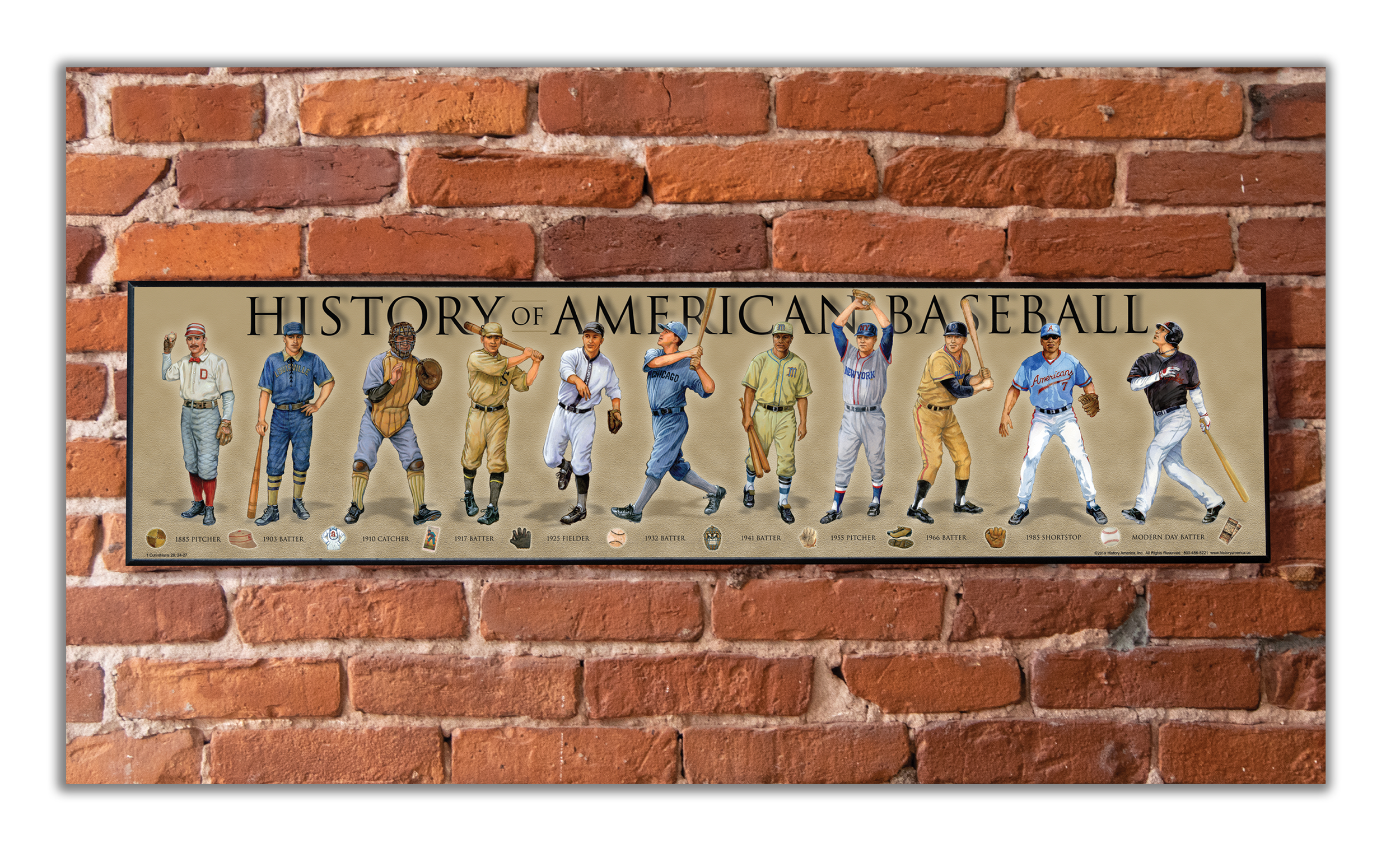 Celebrate America's Past time, from the 1800's to modern day. Players from left to right include: 1885 Pitcher, 1903 Batter, 1910 Catcher, 1917 Batter, 1925 Fielder, 1932 Batter, 1941 Batter, 1955 Pitcher, 1966 Batter, 1985 Shortstop, Modern Day Batter. The time-line has 12 iconic baseball images from 1880s to modern day.