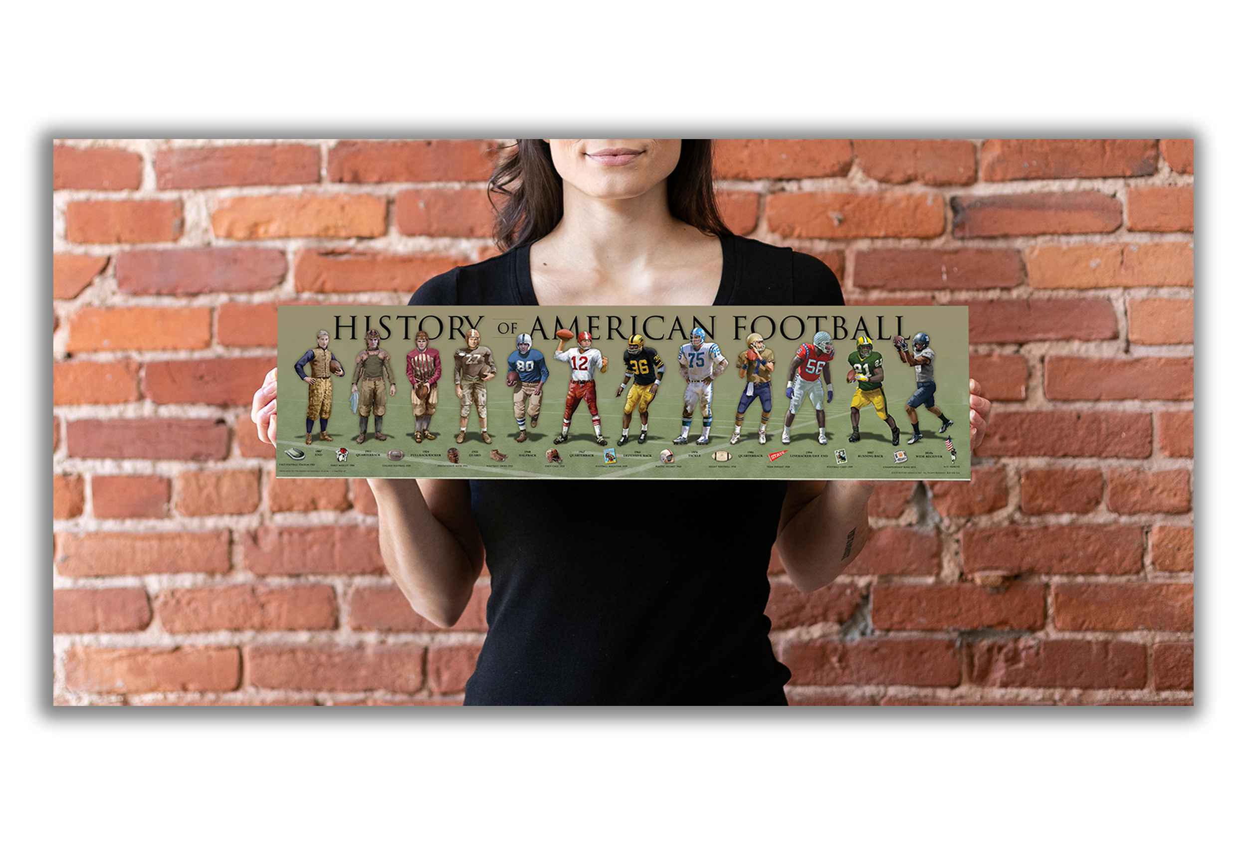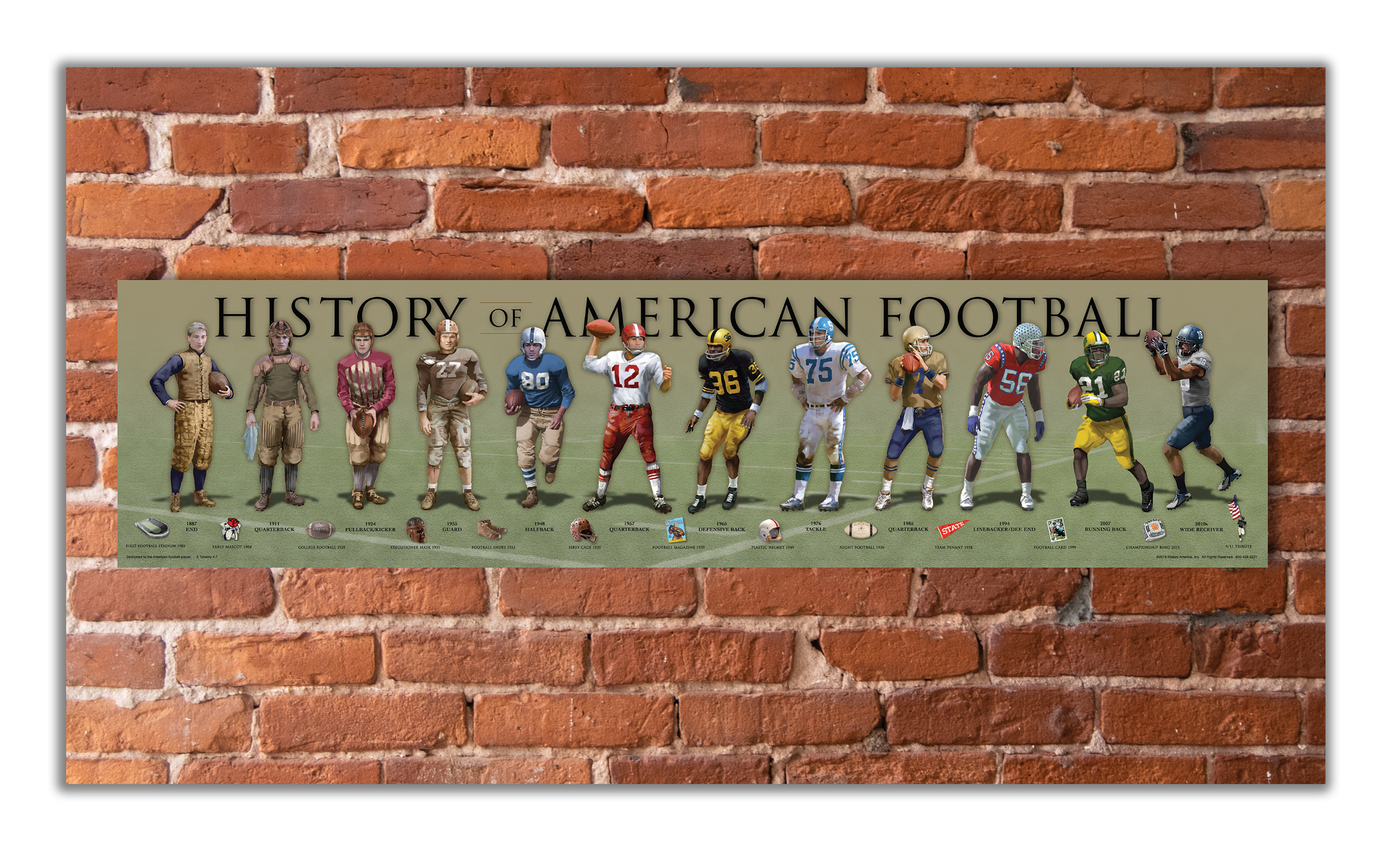 Relive the Gridiron from the late 1880's to modern day. Players include1887 End, 1911 Quarterback, 1924 Fullback/Kicker, 1935 Guard, 1948 Halfback, 1957 Quarterback, 1965 Defensive Back, 1976 Tackle, 1985 Quarterback, 1994 Linebacker/Def. End, 2007 Running Back, Modern Day Receiver. The time-line of 13 iconic football images are from the 1880s to modern day.