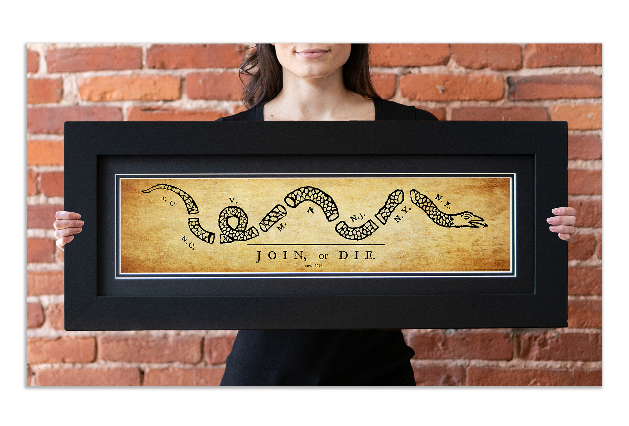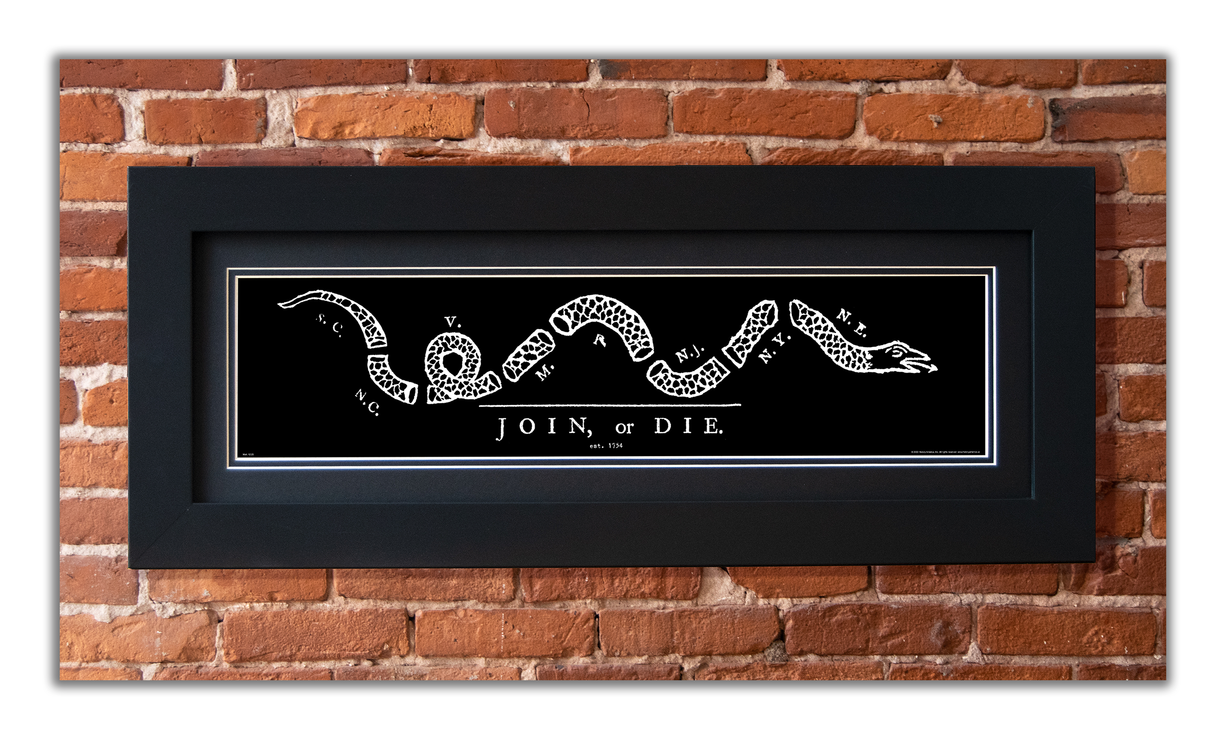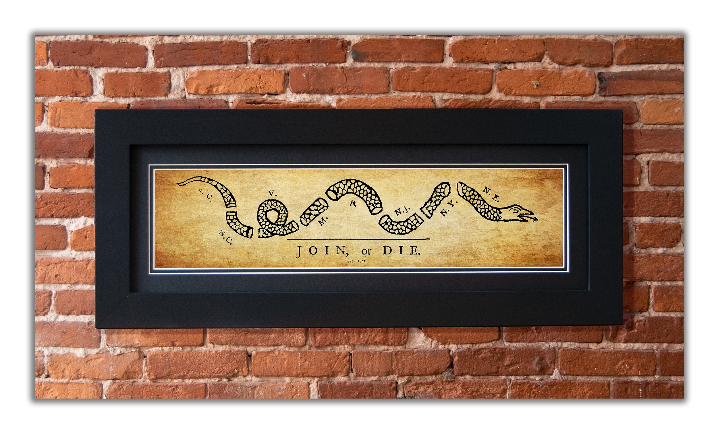 This rendition of Benjamin Franklins famous Join, or Die symbol was created in 1754, as a rallying cry to unite the 13 Colonies during during the French and Indian Wars. Along the bottom of the print is a brief description from when the symbol was created to modern day. Text at bottom of the print says; In 1754, Benjamin Franklin created the now famous Join, or Die, symbol for his newspaper the Pennsylvania Gazette. His drawing was meant to encourage the British ruled 13 colonies to unite against the growing attacks from the French and Indians who had allied themselves to fight the British. In an ironic twist 12 years later, Franklin published the symbol again during the American Revolution, but this time it was used as a rallying cry to unite the 13 colonies in their pursuit of freedom and independence from British tyranny. 80 years later, it again appeared during the Civil War. For over 250 years the image has been edited, painted, and re-sketched. To this day it still has the same message: Encouraging Americans of every race, color, and creed to unite to keep America "the land of the free and the home of the brave." God bless the USA.The print is available in three art choices, white, black and tea stained.