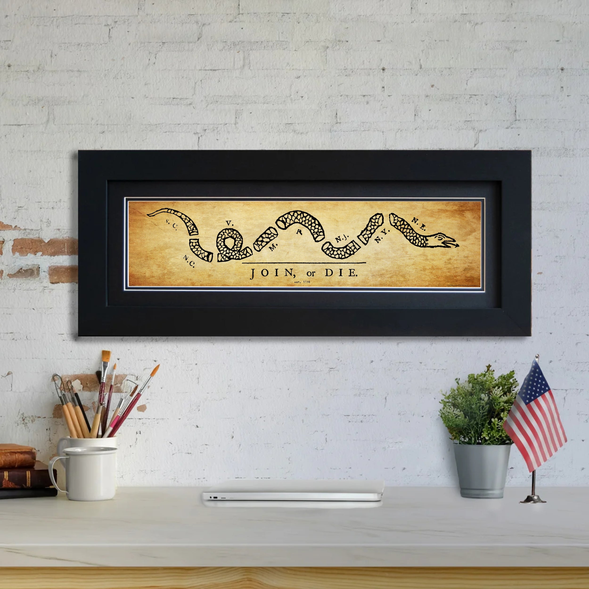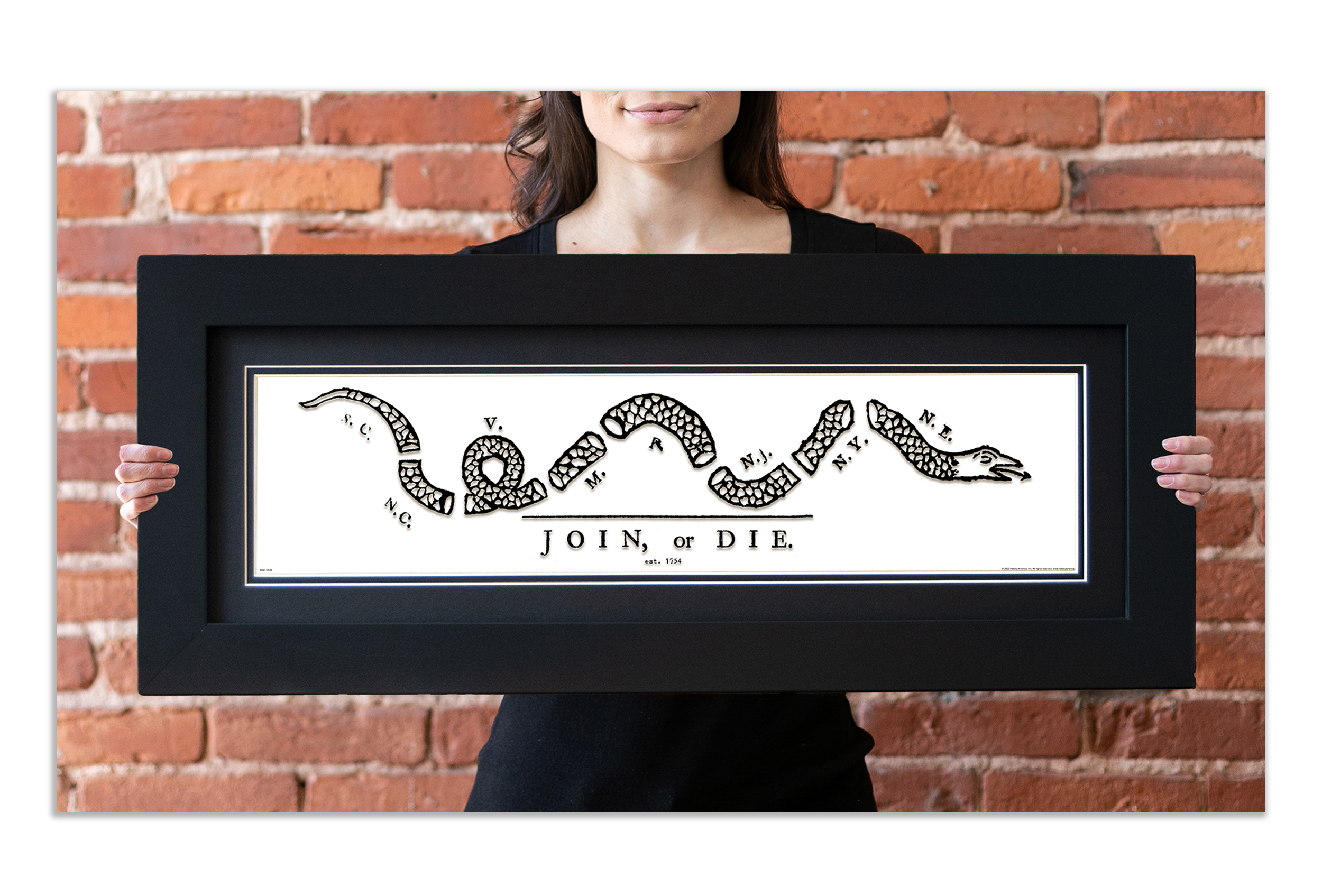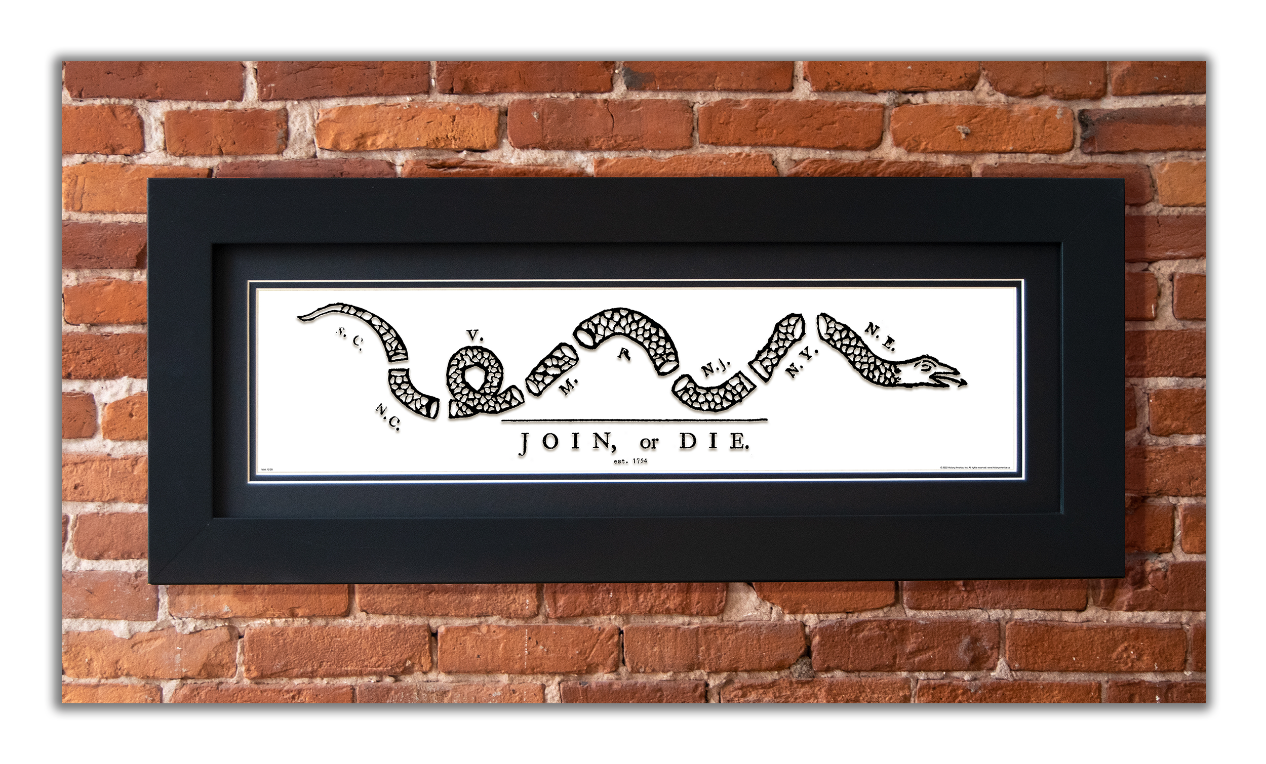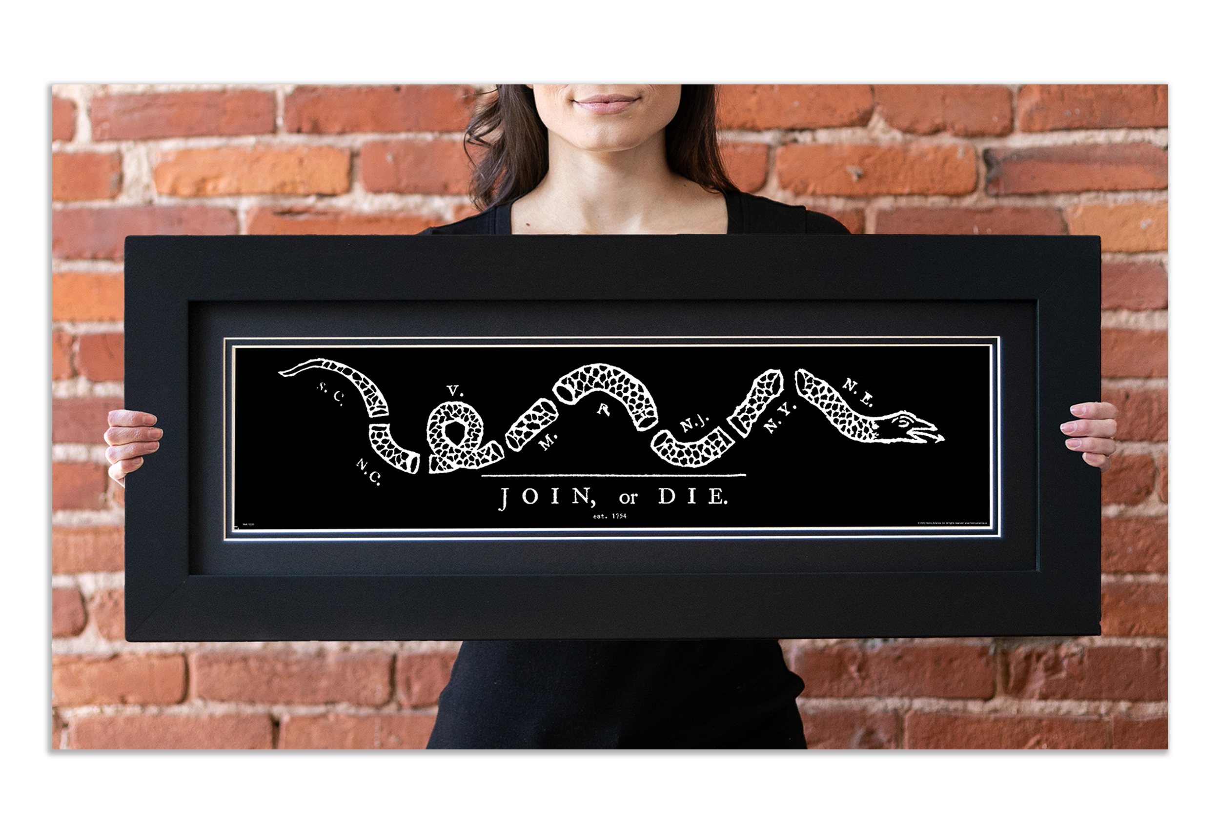 This rendition of Benjamin Franklins famous Join, or Die symbol was created in 1754, as a rallying cry to unite the 13 Colonies during during the French and Indian Wars. Along the bottom of the print is a brief description from when the symbol was created to modern day. Text at bottom of the print says; In 1754, Benjamin Franklin created the now famous Join, or Die, symbol for his newspaper the Pennsylvania Gazette. His drawing was meant to encourage the British ruled 13 colonies to unite against the growing attacks from the French and Indians who had allied themselves to fight the British. In an ironic twist 12 years later, Franklin published the symbol again during the American Revolution, but this time it was used as a rallying cry to unite the 13 colonies in their pursuit of freedom and independence from British tyranny. 80 years later, it again appeared during the Civil War. For over 250 years the image has been edited, painted, and re-sketched. To this day it still has the same message: Encouraging Americans of every race, color, and creed to unite to keep America "the land of the free and the home of the brave." God bless the USA.The print is available in three art choices, white, black and tea stained.
