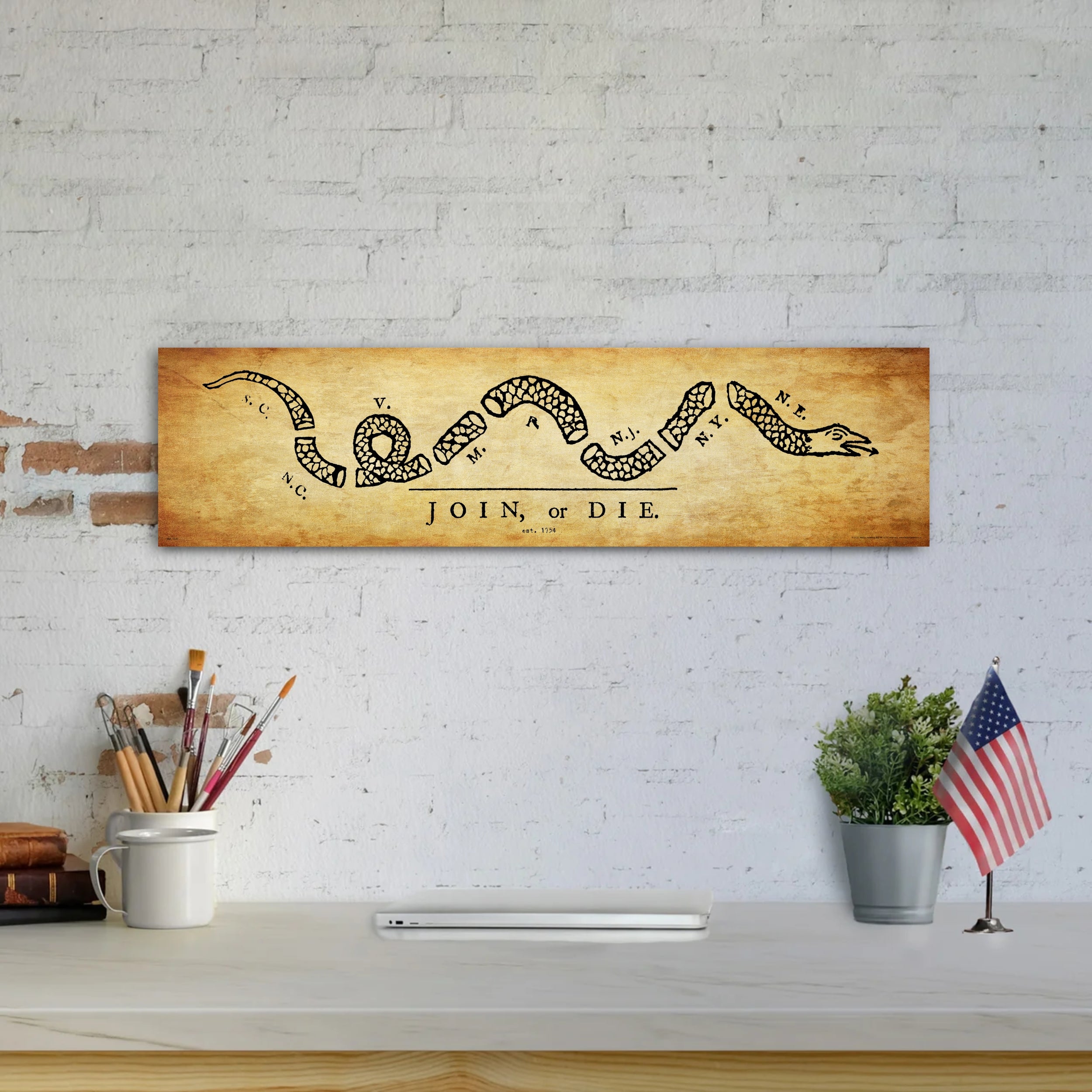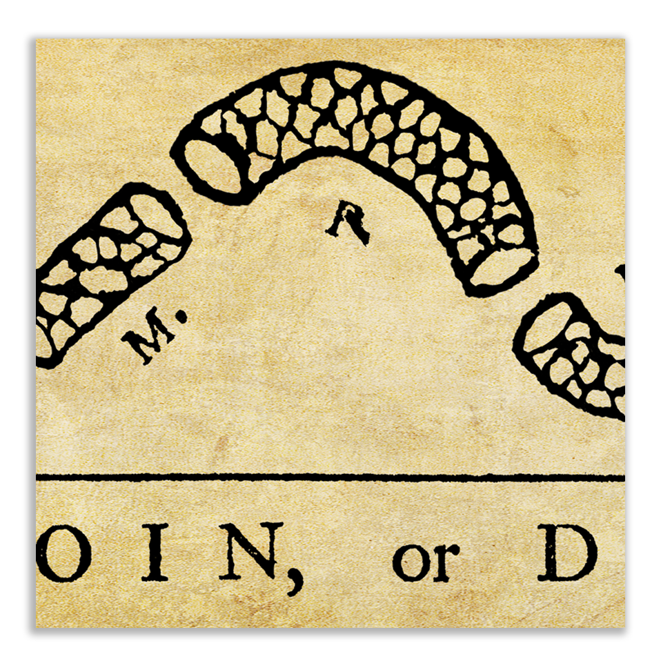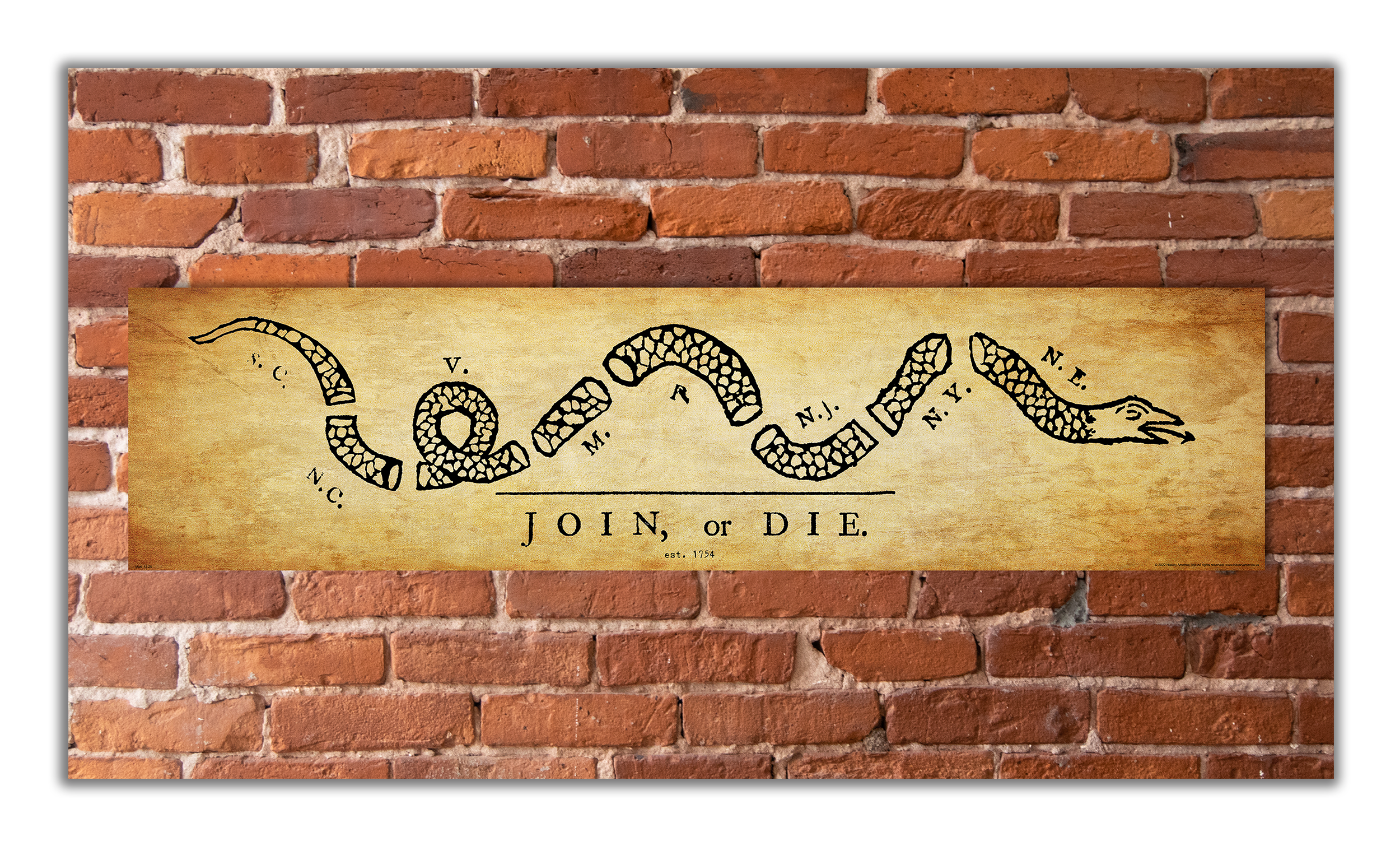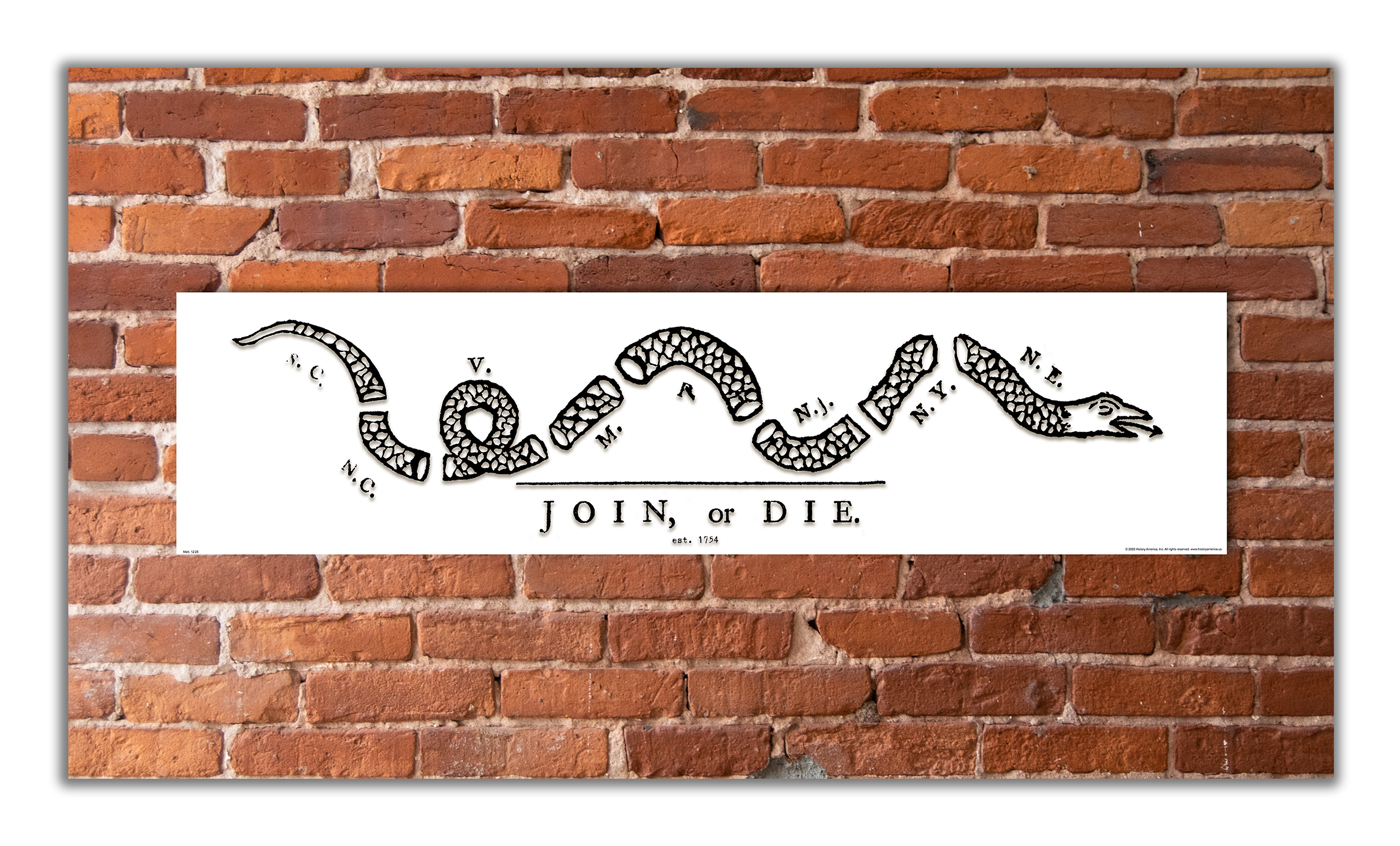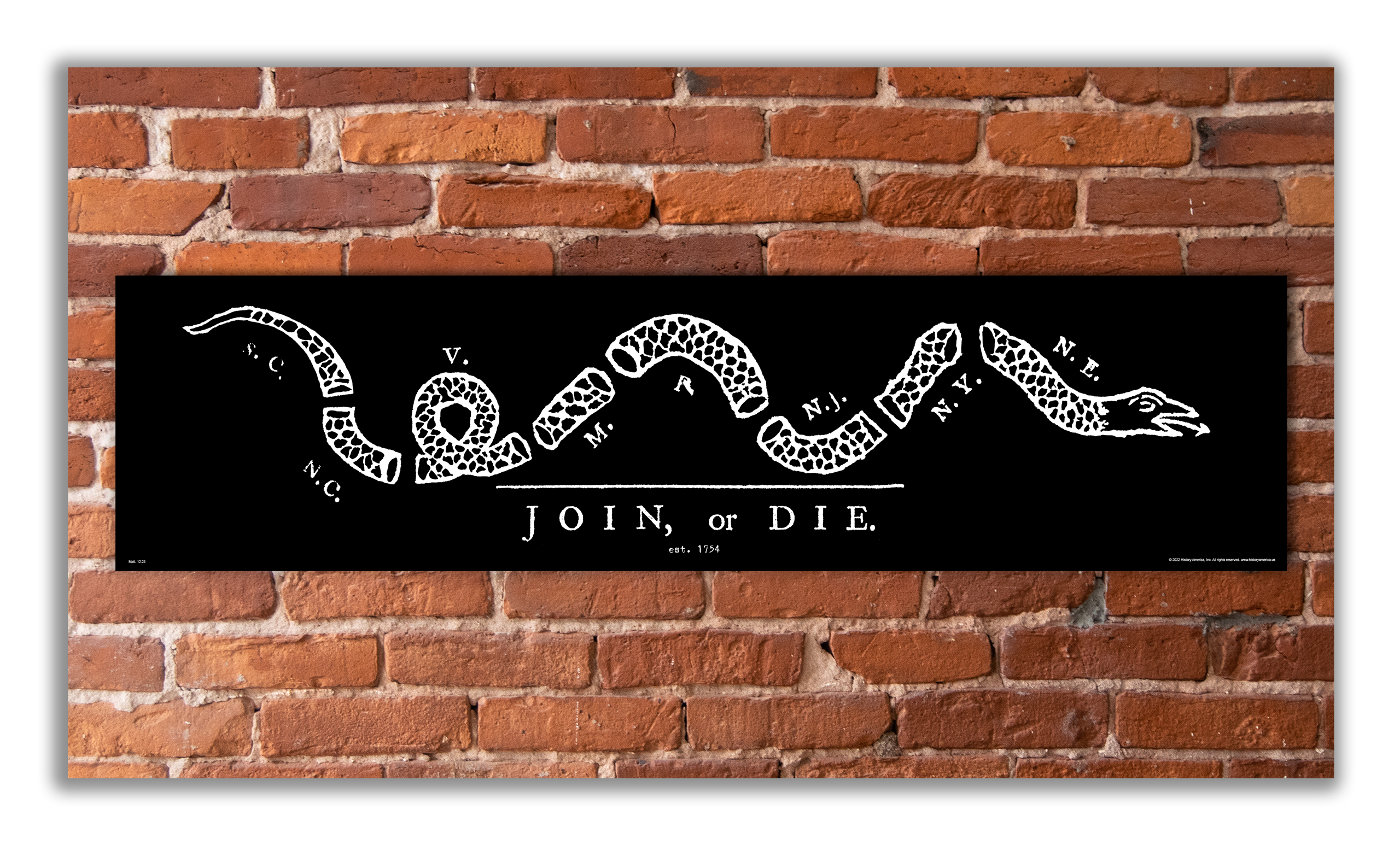 This rendition of Benjamin Franklins famous Join, or Die symbol was created in 1754, as a rallying cry to unite the 13 Colonies during during the French and Indian Wars. Along the bottom of the print is a brief description from when the symbol was created to modern day. The print is available in three art choices, white, black and tea stained.