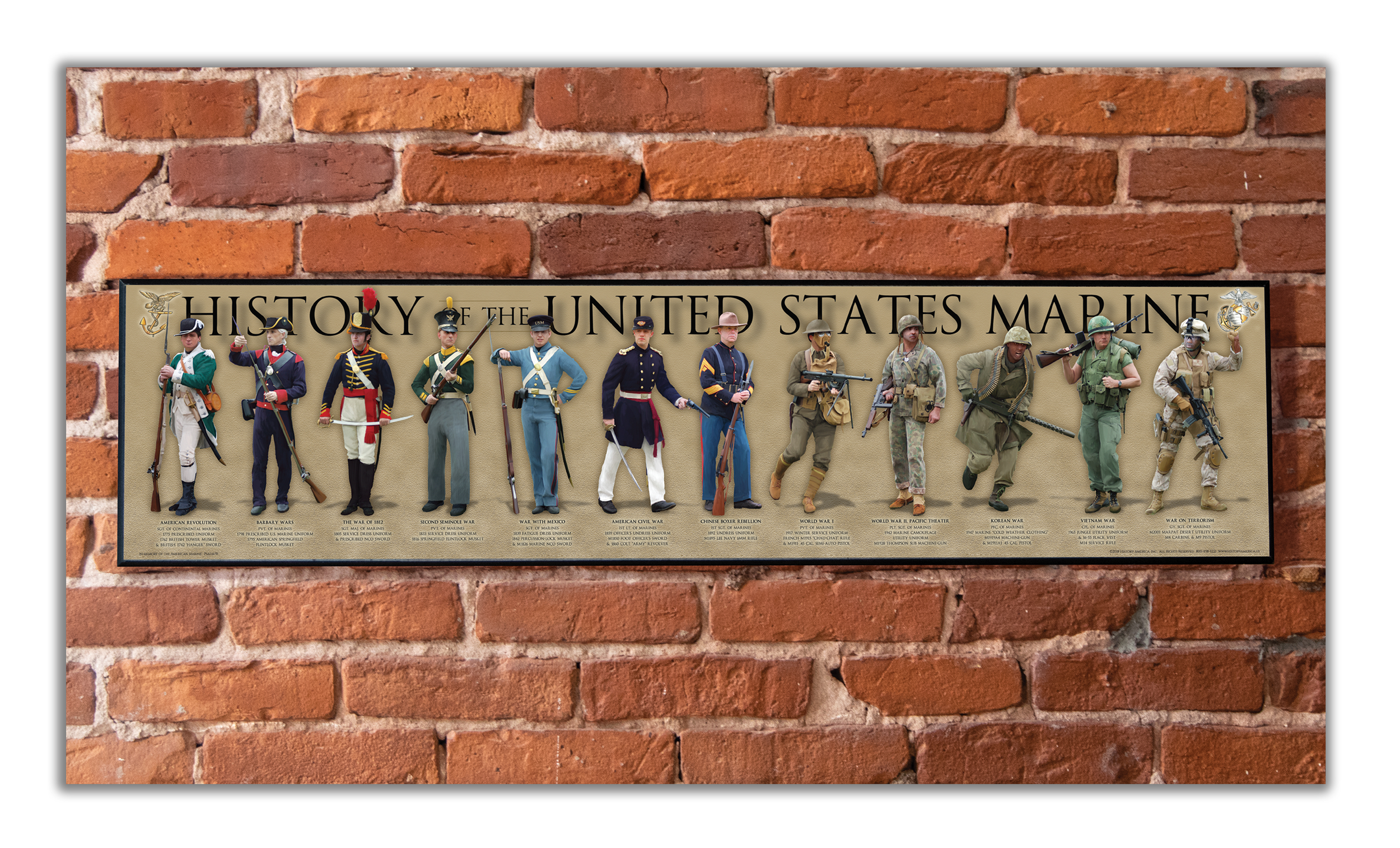 Salute the "Few the Proud the Brave" the USMC. Marines from left to right include: Continental Marine, Barbary War, War of 1812, Second Seminole War, War with Mexico, Civil War, Chinese Boxer Rebellion, World War I, World War II, Korean War, Vietnam War and Modern Day. Under each Marine are their rank, uniform, conflict, and weapon(s).