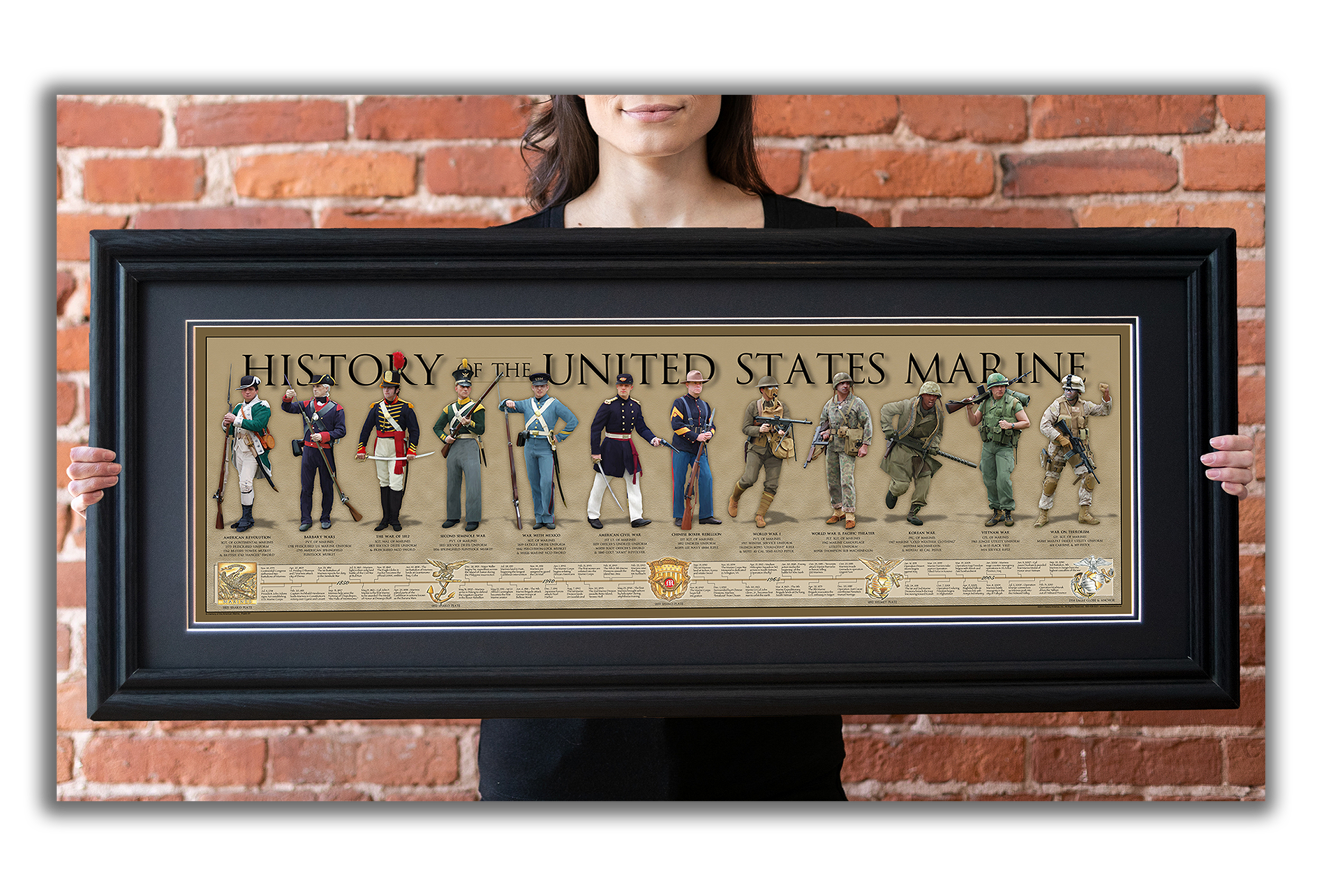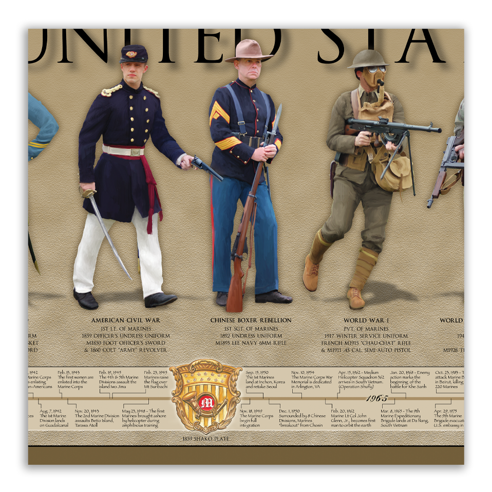 Salute the "Few the Proud the Brave" the USMC. Marines from left to right include: Continental Marine, Barbary War, War of 1812, Second Seminole War, War with Mexico, Civil War, Chinese Boxer Rebellion, World War I, World War II, Korean War, Vietnam War and Modern Day. The 54 point time-line includes important dates, facts and five Marine emblems from the 1854 Shako Plate to the Modern Day Eagle Globe and Anchor.