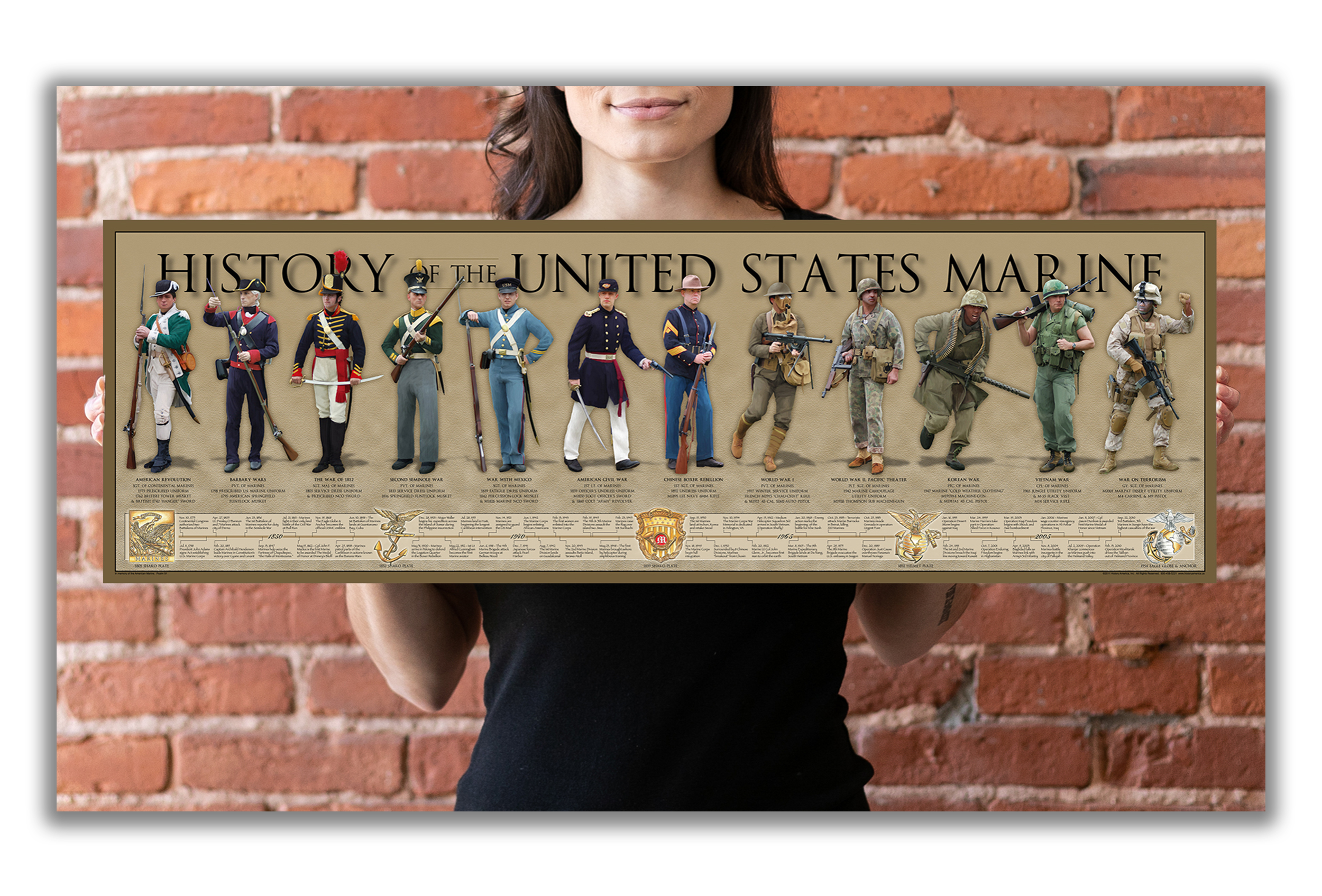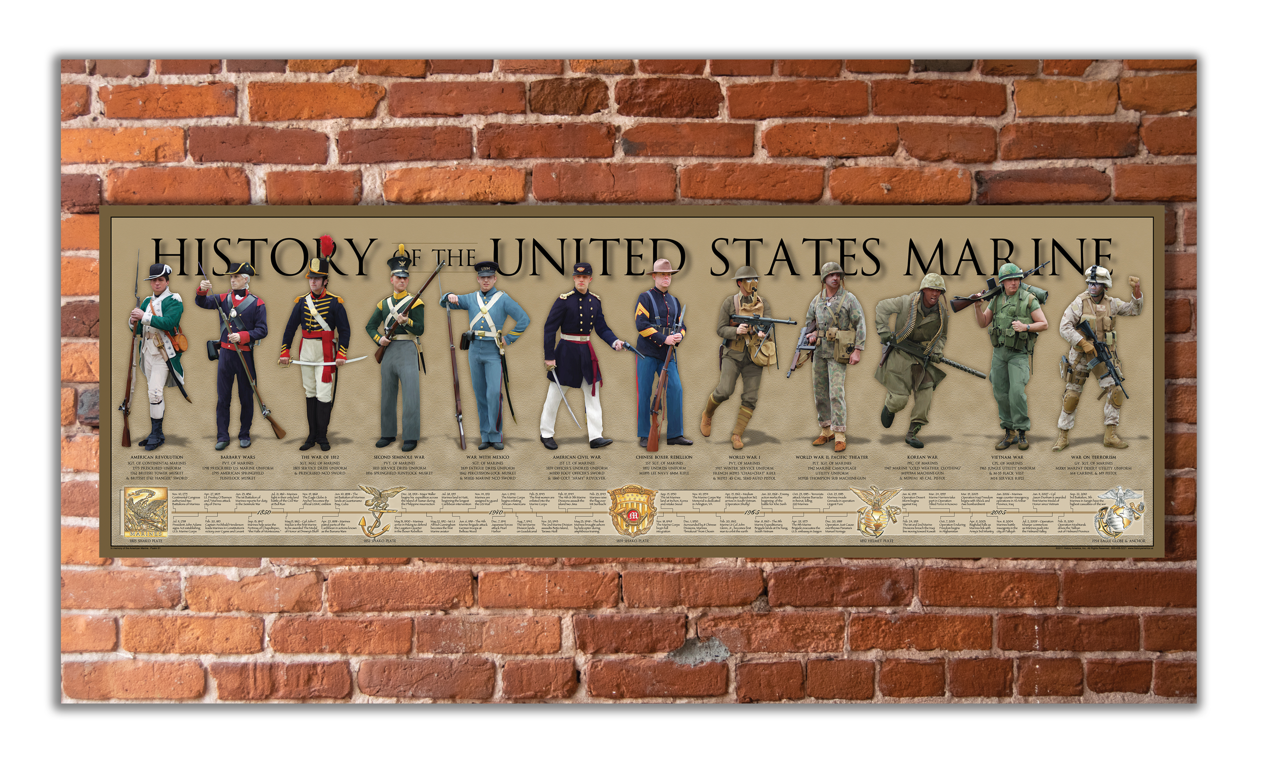 Salute the "Few the Proud the Brave" the USMC. Marines from left to right include: Continental Marine, Barbary War, War of 1812, Second Seminole War, War with Mexico, Civil War, Chinese Boxer Rebellion, World War I, World War II, Korean War, Viet Nam War and Modern Day. The 54 point time-line includes important dates, facts and five Marine emblems from the 1854 Shako Plate to the Modern Day Eagle Globe and Anchor.