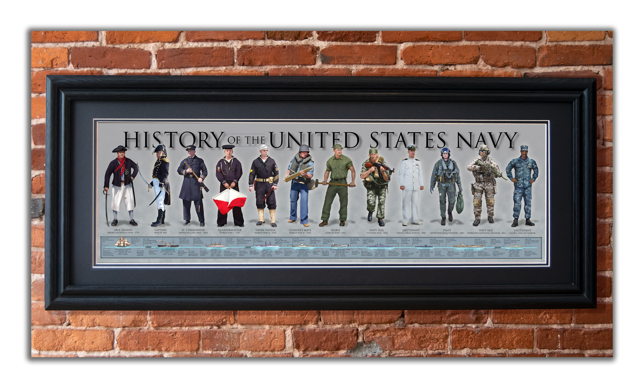 Explore the proud legacy of the USN. Navy personal from left to right: Able Seaman - American Revolution, Captain - War of 1812, LT Commander - Civil War, Quartermaster - WWI, Shore Patrol - WWII, Gunners Mate - WWII, Seabee - Korean War, Navy Seal - Vietnam War, Lieutenant - Dress Whites, Pilot - Iraq War, Navy Seal - Afghanistan War, Lieutenant - Blue Digitals. The 45 point time-line includes dates, facts and 10 iconic NAVY vessels from pre Revolution to modern day.