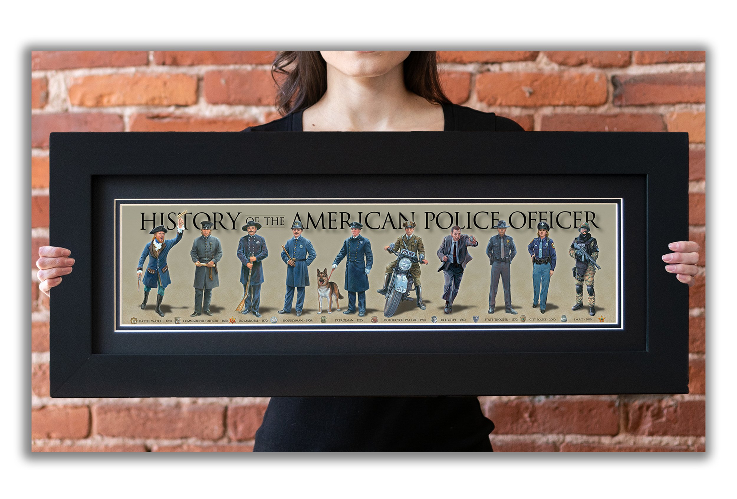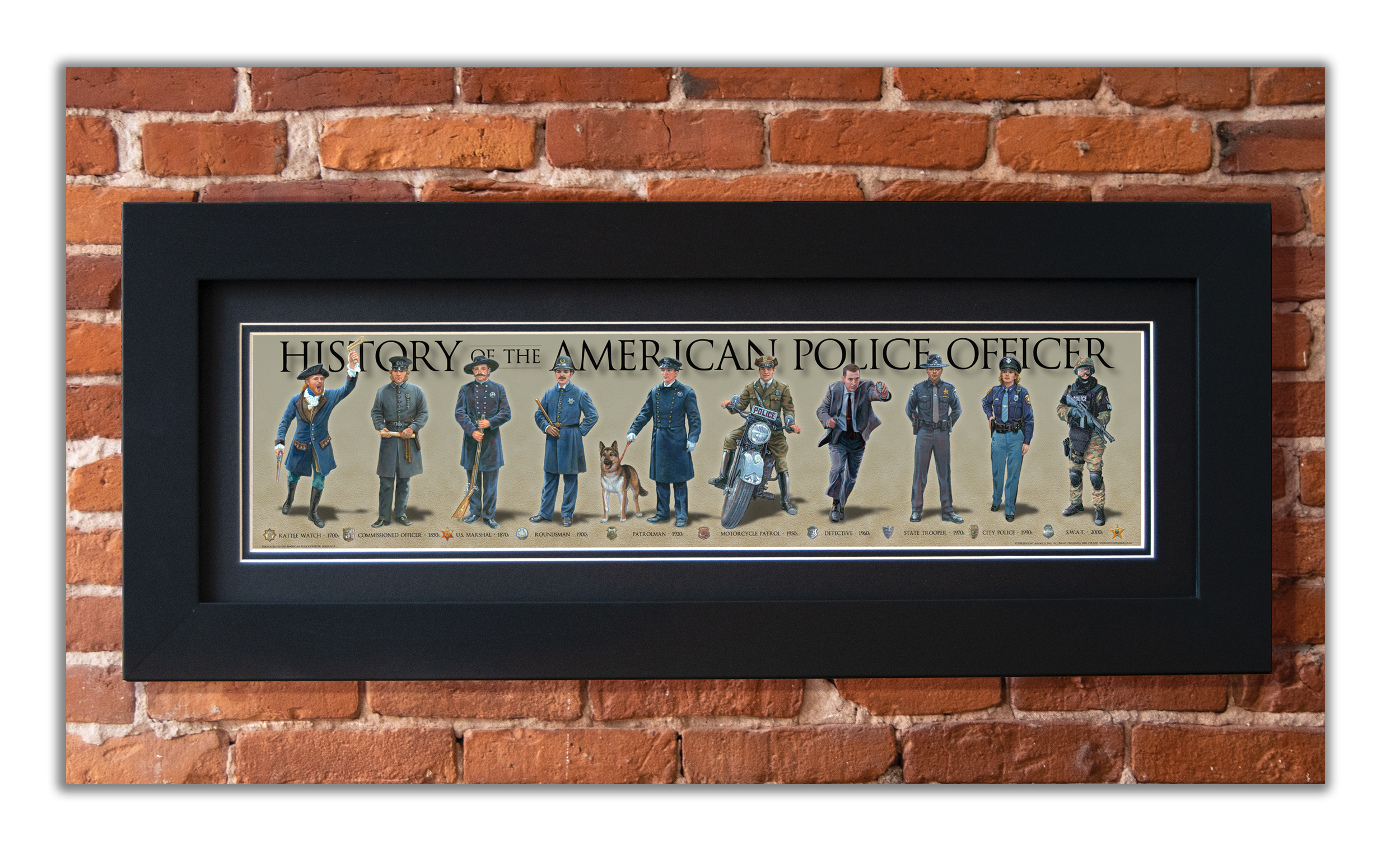 History of the American Police Officer - Framed 2" Black Double Matted, Flat Molding 6" x 24"
