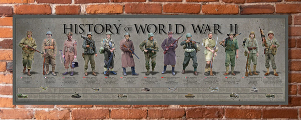 From the first shots in Poland to Japan’s final surrender, relive the sweeping history of World War II. This detailed print showcases thirteen soldiers from ten nations—the United States, France, Great Britain, Germany, Canada, Poland, the Soviet Union, Italy, Australia, and Japan—each depicted with authentic uniforms and ranks. Together, they stand as a powerful tribute to the men and women who fought in the largest and most devastating war the world has ever known.