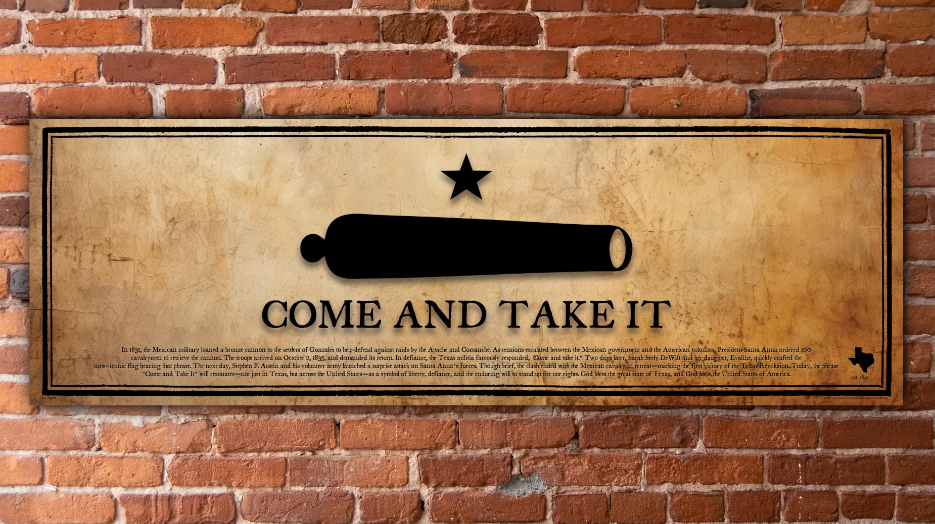 Our version of Come and Take It features a full description beneath the cannon, recounting the birth of this now-famous phrase—one that continues to embody liberty, defiance, and the enduring will to stand up for our rights.