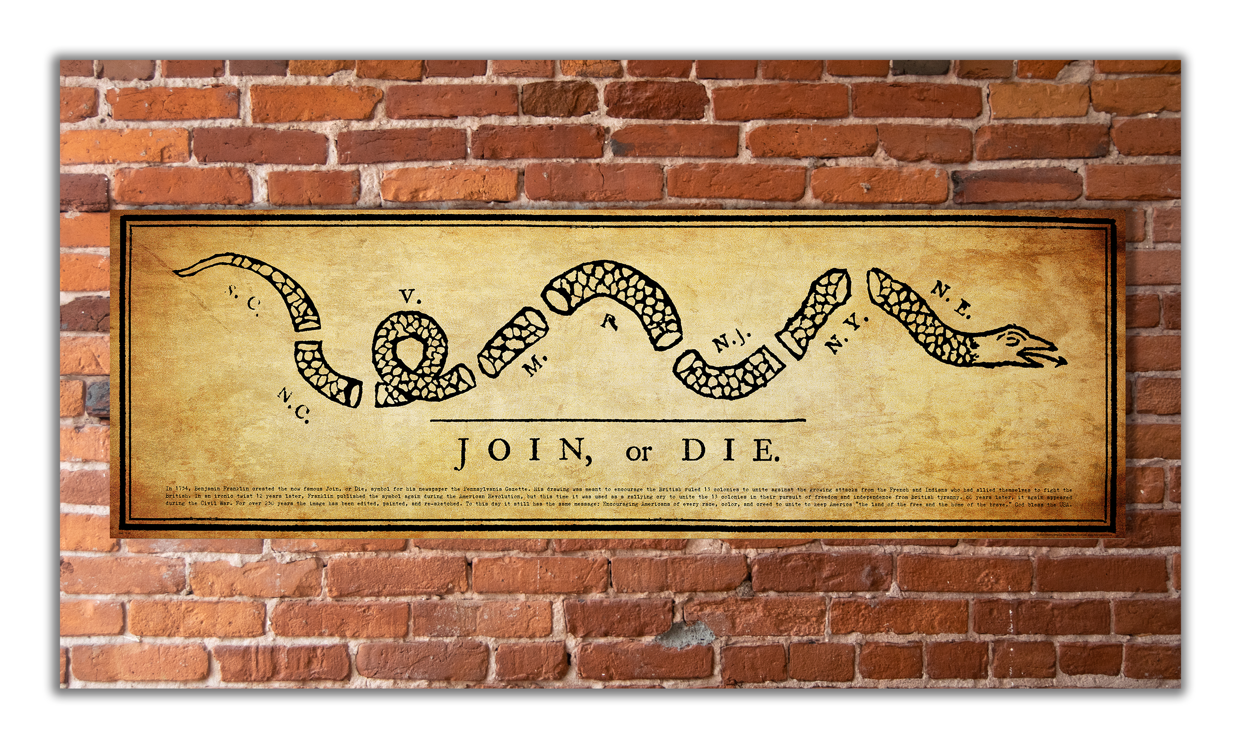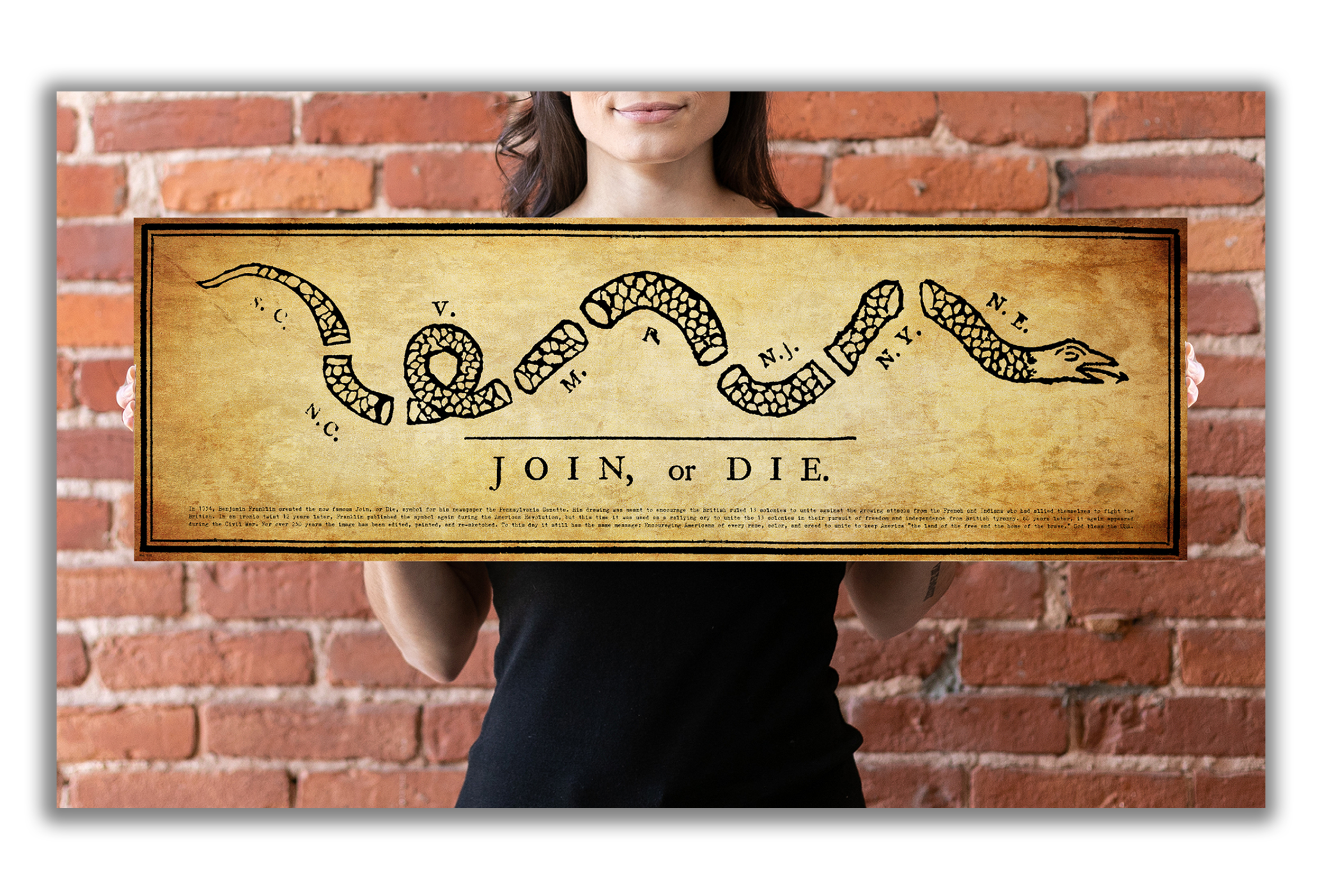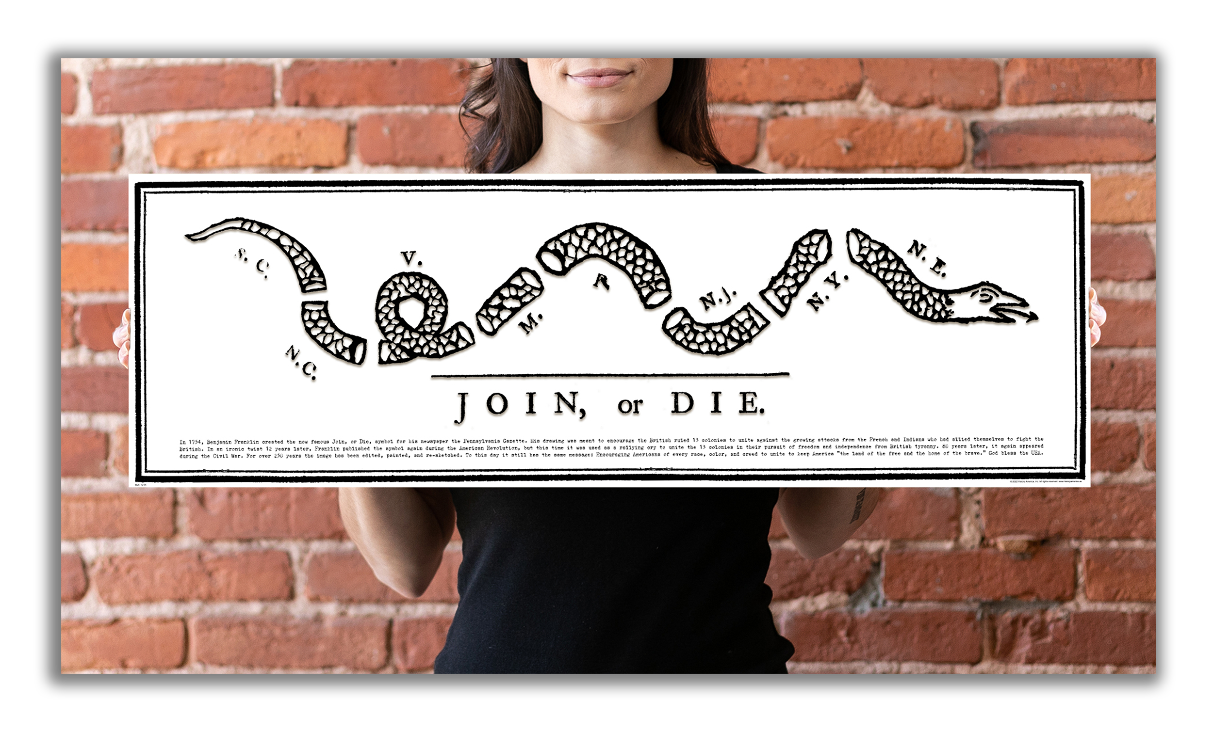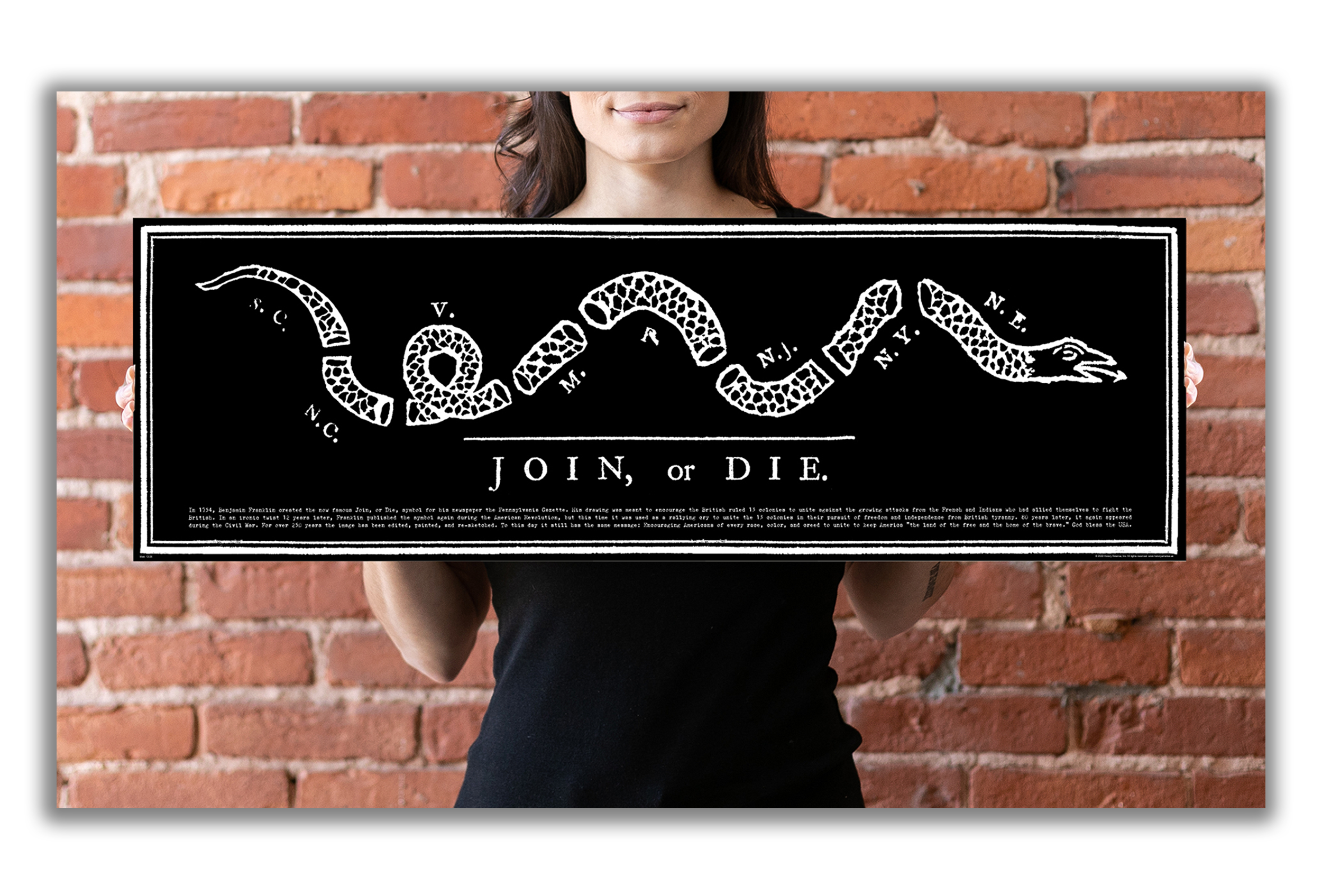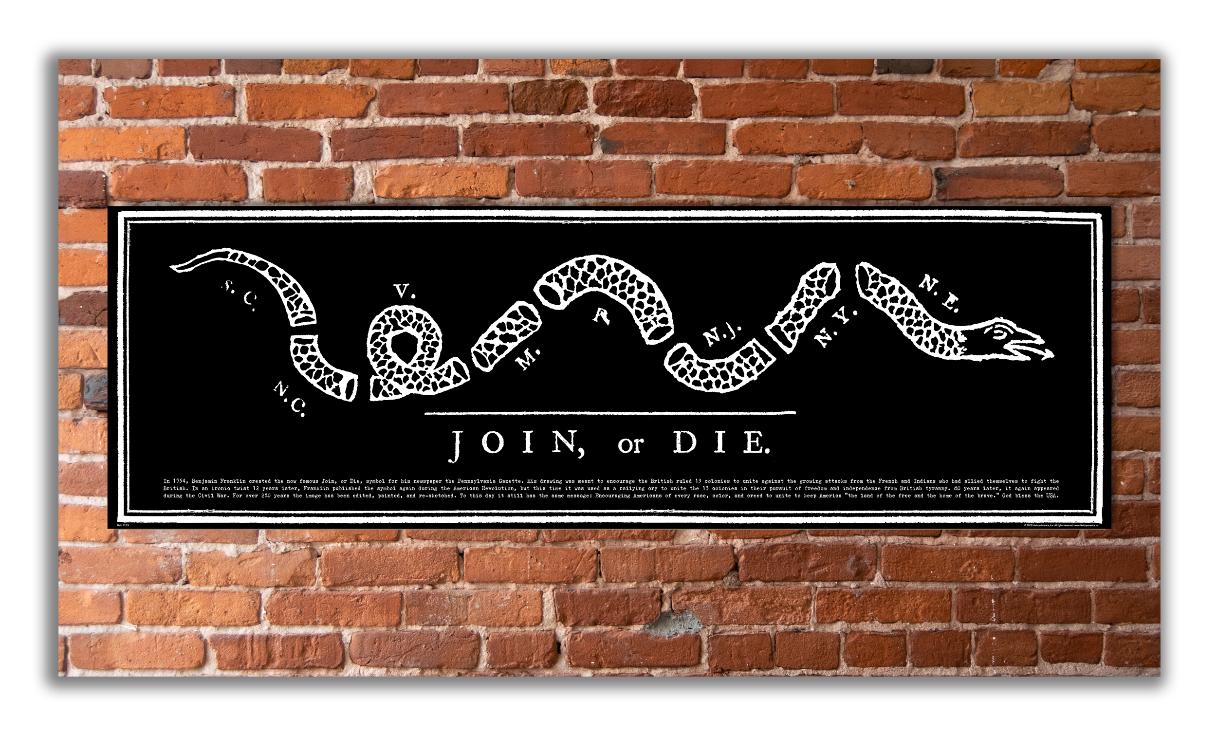 This rendition of Benjamin Franklins famous Join, or Die symbol was created in 1754, as a rallying cry to unite the 13 Colonies during during the French and Indian Wars. Along the bottom of the print is a brief description from when the symbol was created to modern day. Text at bottom of the print says; In 1754, Benjamin Franklin created the now famous Join, or Die, symbol for his newspaper the Pennsylvania Gazette. His drawing was meant to encourage the British ruled 13 colonies to unite against the growing attacks from the French and Indians who had allied themselves to fight the British. In an ironic twist 12 years later, Franklin published the symbol again during the American Revolution, but this time it was used as a rallying cry to unite the 13 colonies in their pursuit of freedom and independence from British tyranny. 80 years later, it again appeared during the Civil War. For over 250 years the image has been edited, painted, and re-sketched. To this day it still has the same message: Encouraging Americans of every race, color, and creed to unite to keep America "the land of the free and the home of the brave." God bless the USA.The print is available in three art choices, white, black and tea stained.