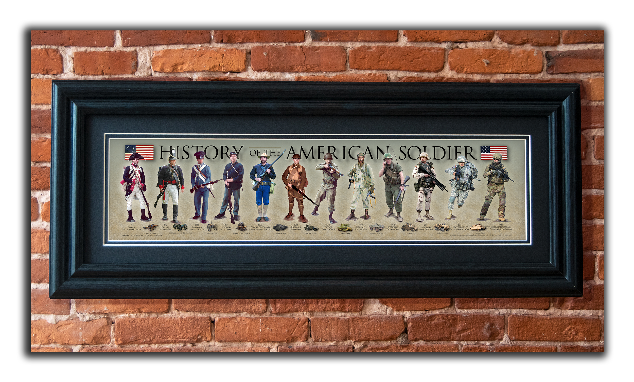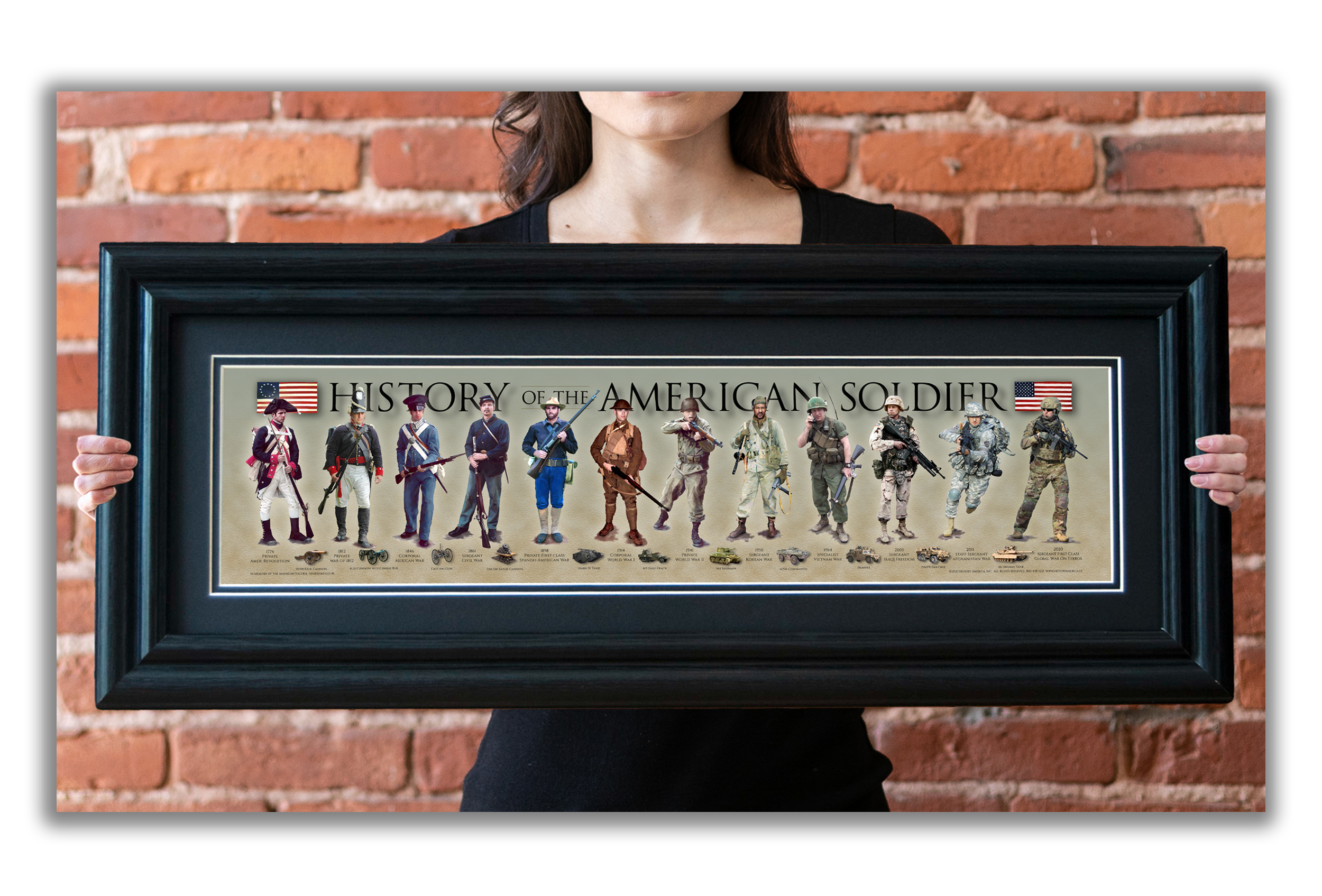 History of the American Soldier - Revel in the brave tradition of the American Soldier, from the Colonial Minutemen to the modern-day Soldier. Soldiers from left to right include: American Revolution, War of 1812, Mexican War, Civil War, Spanish-American War, World War I, World War II, Korean War, Vietnam War, Iraqi Freedom, War in Afghanistan, and the Global War on Terror (Modern Day). Along the bottom of the print are eleven iconic images, spanning from 1776 to modern day.