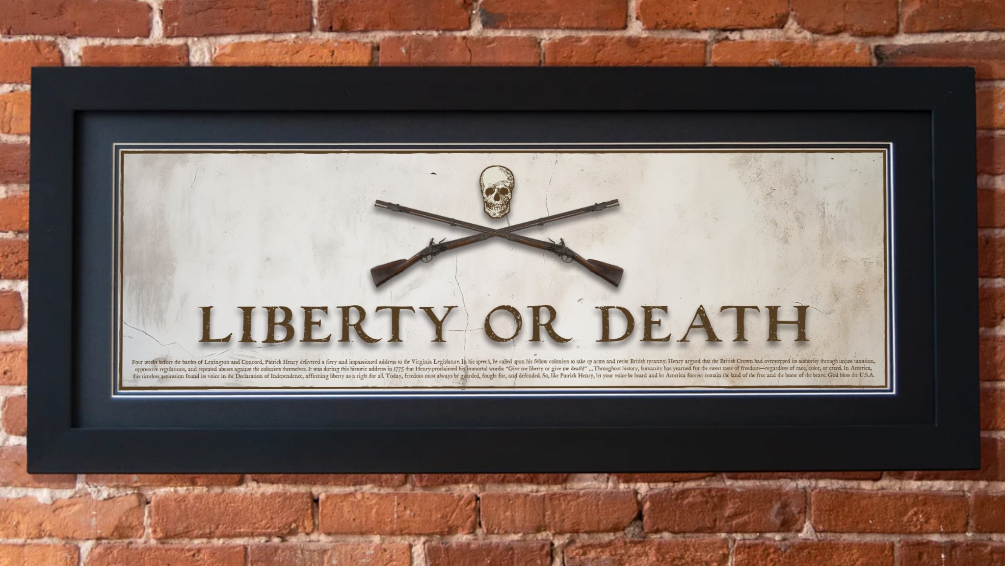 Liberty or Death – The legendary quote “Give me liberty, or give me death!” was delivered by Patrick Henry in 1775 as he urged his fellow colonists to take up arms against British tyranny. This print showcases the words Liberty or Death in bold, distressed lettering, accompanied by the iconic crossed muskets and skull. Along the bottom is a detailed description explaining what the quote meant nearly 250 years ago—and what it continues to signify today.