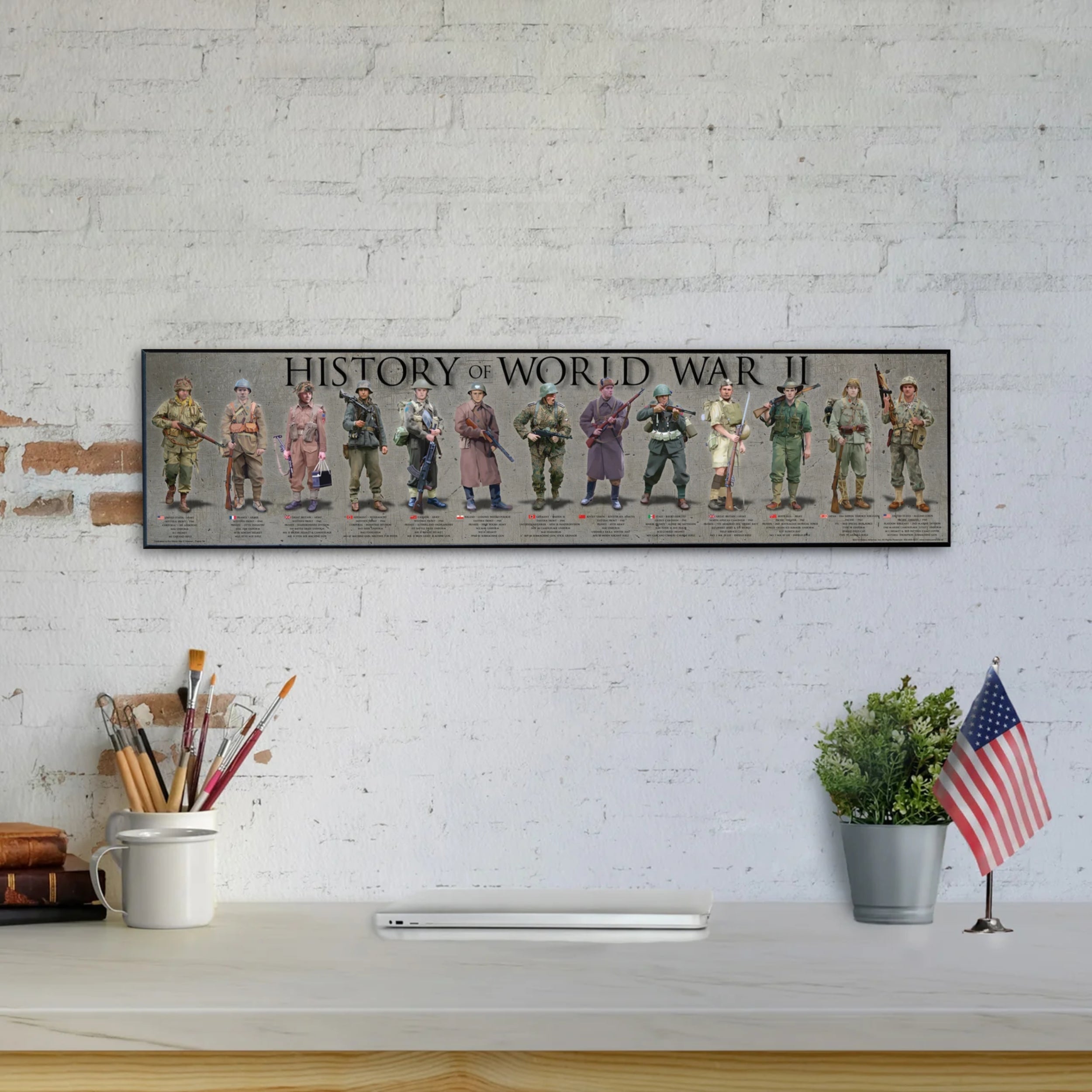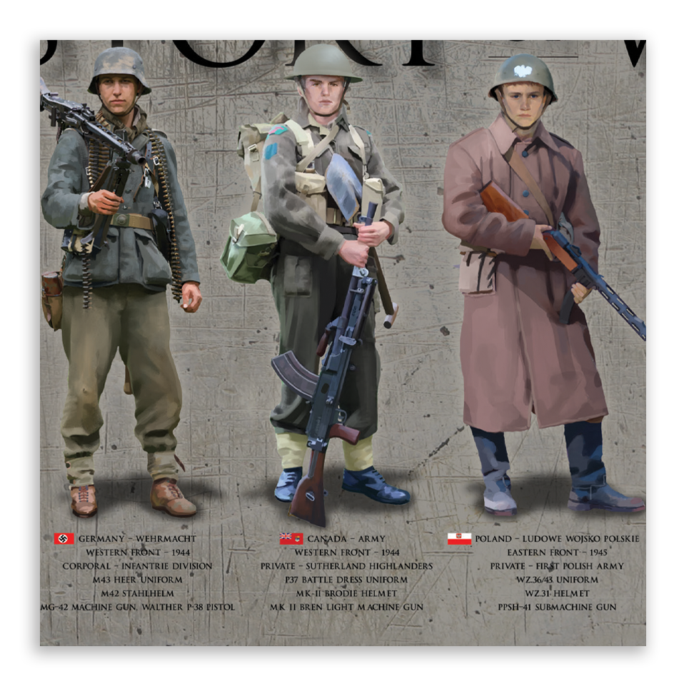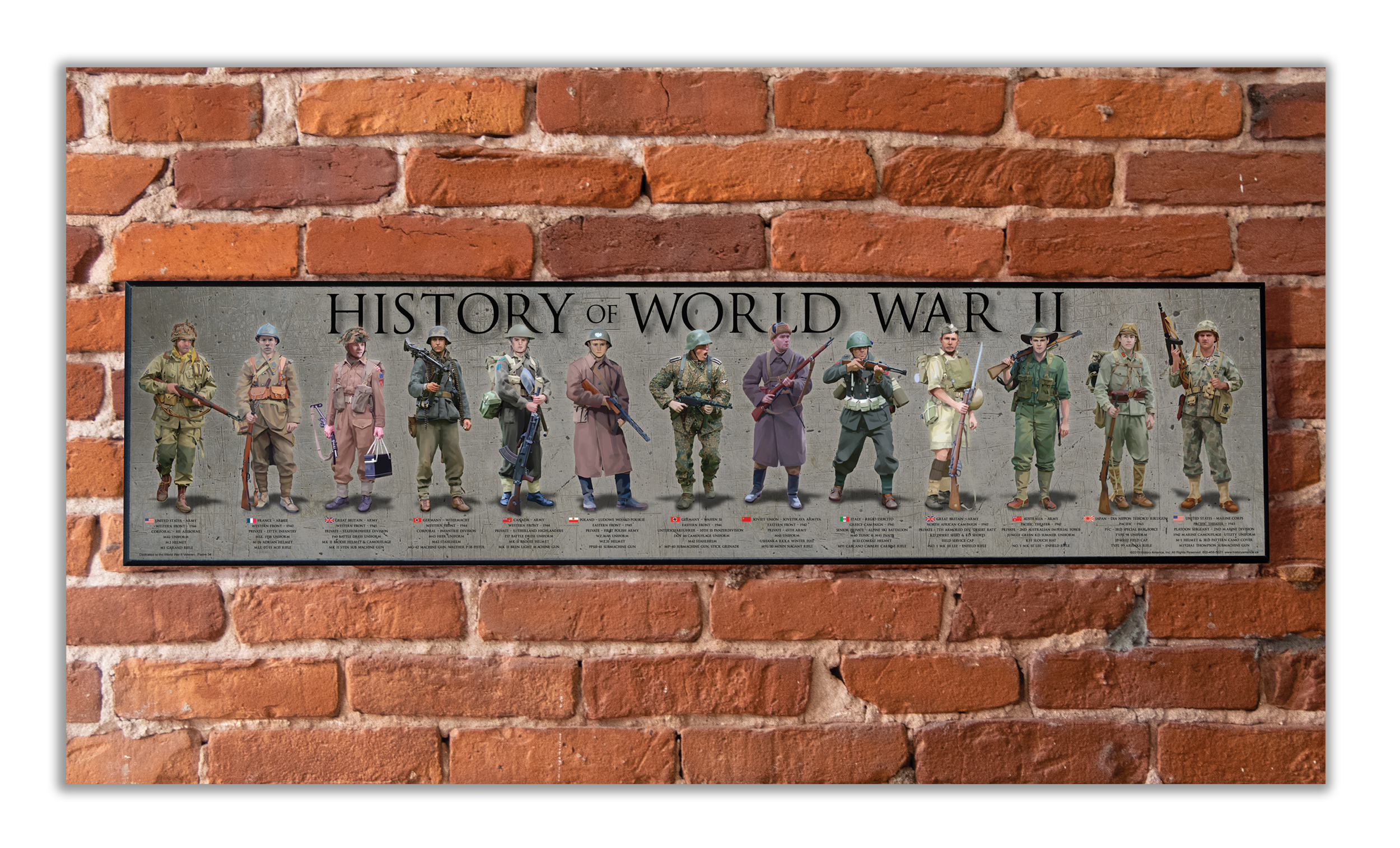 History of World War II - From the invasion of Poland to Japan’s surrender, learn about the world’s deadliest war. The thirteen soldiers represent ten countries, including: the United States, France, Great Britain, Germany, Canada, Poland, the Soviet Union, Italy, Australia, and Japan. Beneath each soldier is their country’s flag, rank, uniform, conflict, and weapon(s).