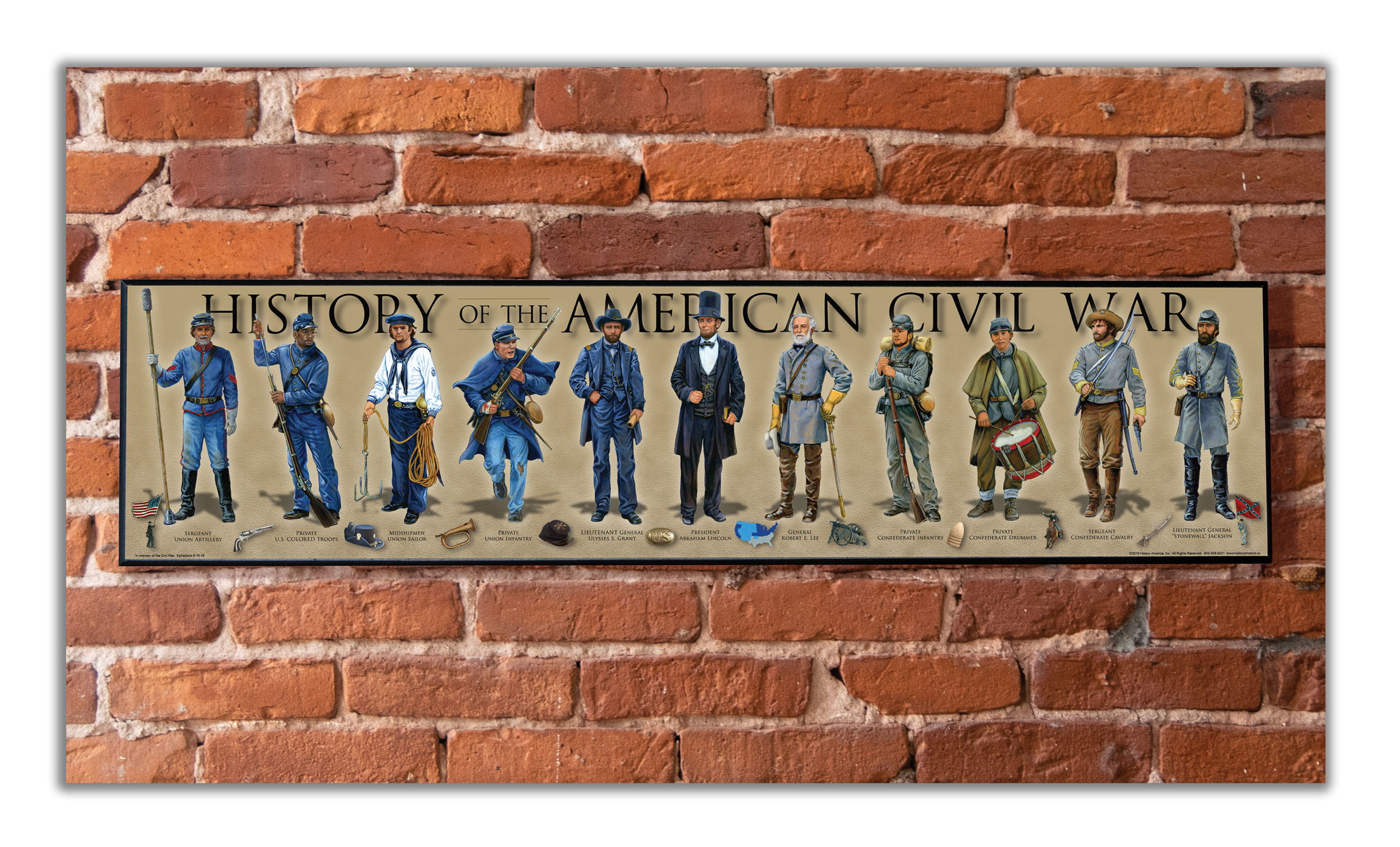 History of the American Civil War - From Fort Sumter to Appomattox, discover America’s most enduring war. The eleven iconic images include: Union Artillery, U.S. Colored Troops, Union Sailor, Union Infantry, General Grant, President Lincoln, General Lee, Confederate Infantry, Confederate Drummer, Confederate Cavalry, and General “Stonewall” Jackson. The timeline features thirteen iconic Civil War images representing both the Union and the Confederacy.