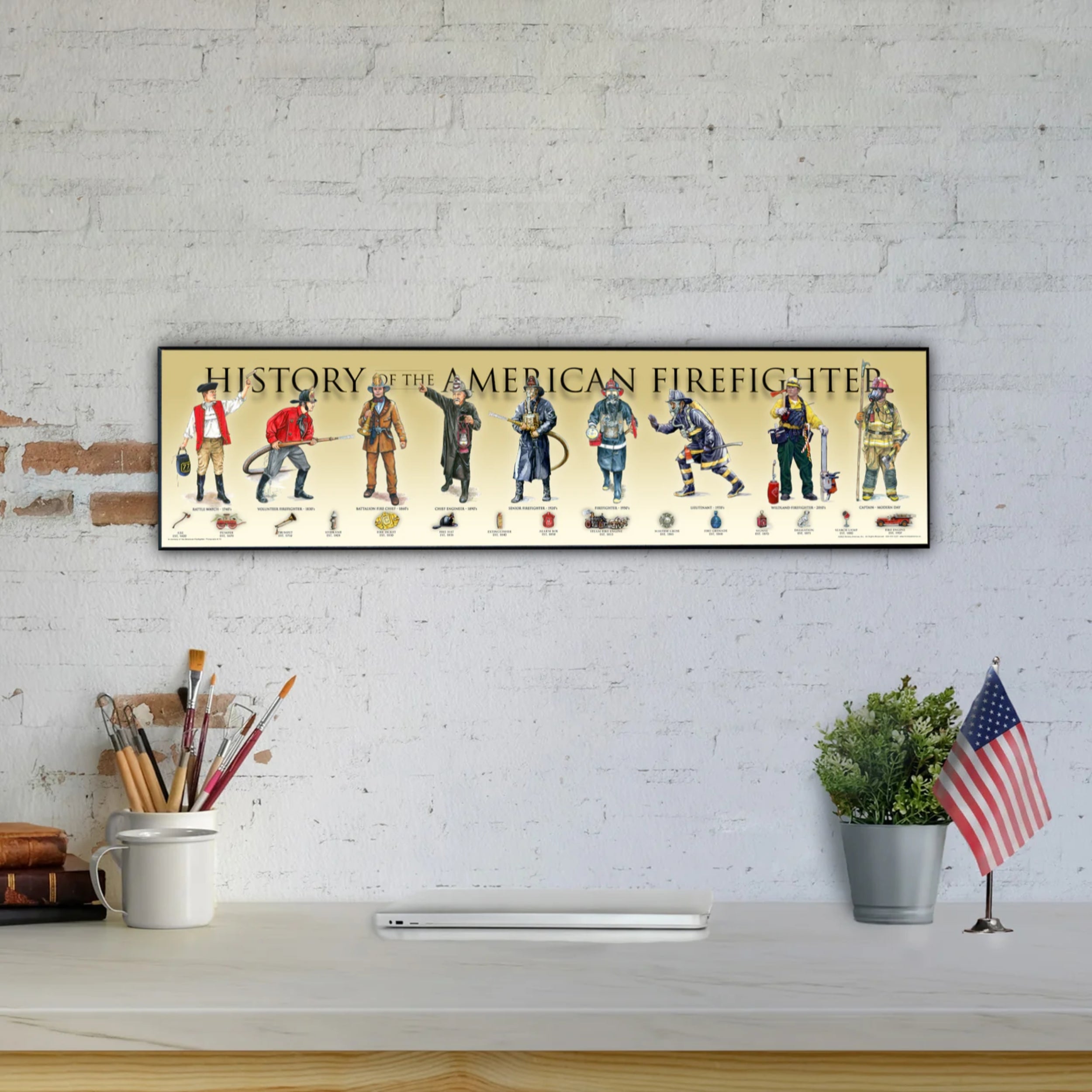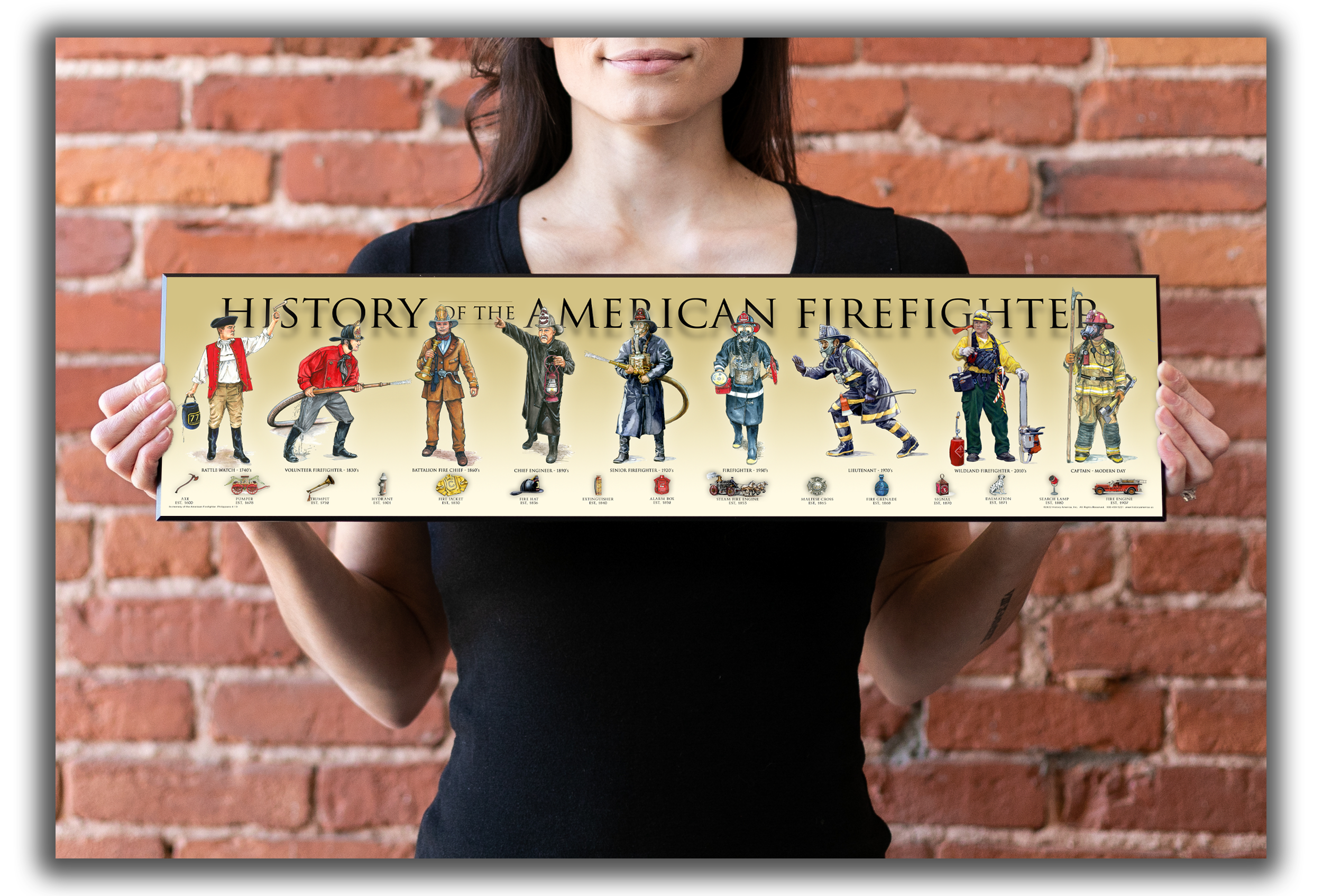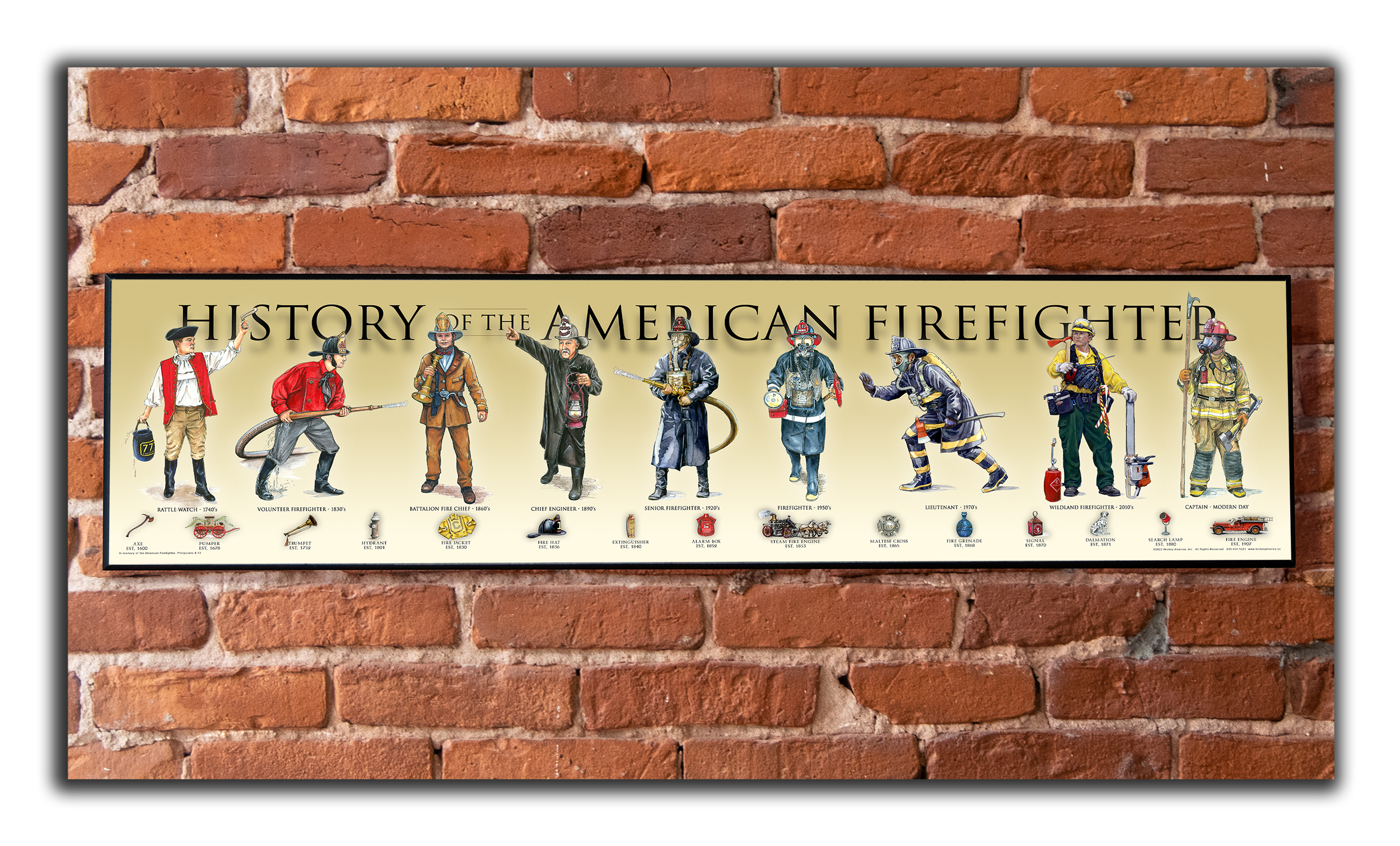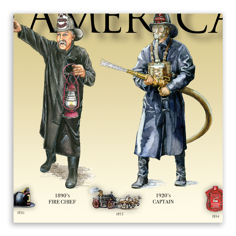 History of the American Firefighter - Honor the rich history of the American firefighter, from the pre-Revolutionary days of the 1700s to today’s modern heroes. This print features: the 1740s Rattle Watch, 1830s Volunteer, 1860s Volunteer, 1890s Fire Chief, 1920s Firefighter, 1950s Firefighter, 1970s Firefighter, 1990s Fire Inspector, and the modern-day Firefighter. The timeline of images also highlights important inventions and developments in American firefighting history.