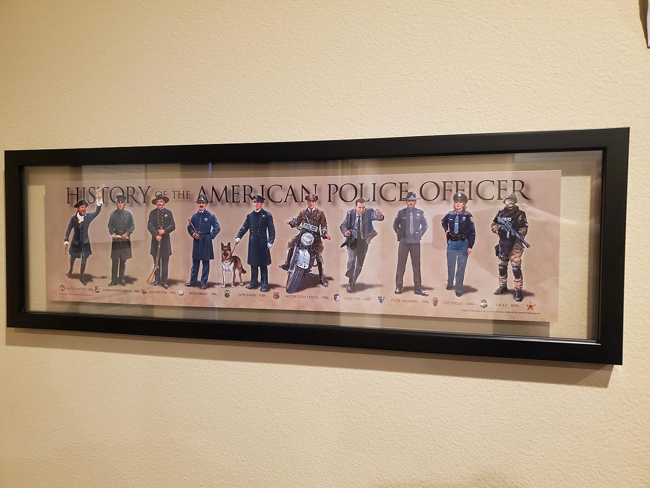 History of the American Police Officer - Discover the bold legacy of the American Police Officer, from the colonial-era “Rattle Watch” to the present-day officer. Titles from left to right include: Rattle Watch (1700s), Commissioned Officer (1800s), U.S. Marshal (1870s), Roundsman (1900s), Patrolman (1920s), Motorcycle Patrol (1950s), Detective (1960s), State Trooper (1970s), City Police (2000s), S.W.A.T. (2010s), and the modern-day uniformed officer. Beneath the eleven police officers is a timeline of police badges, spanning from the 1800s to the modern day.
