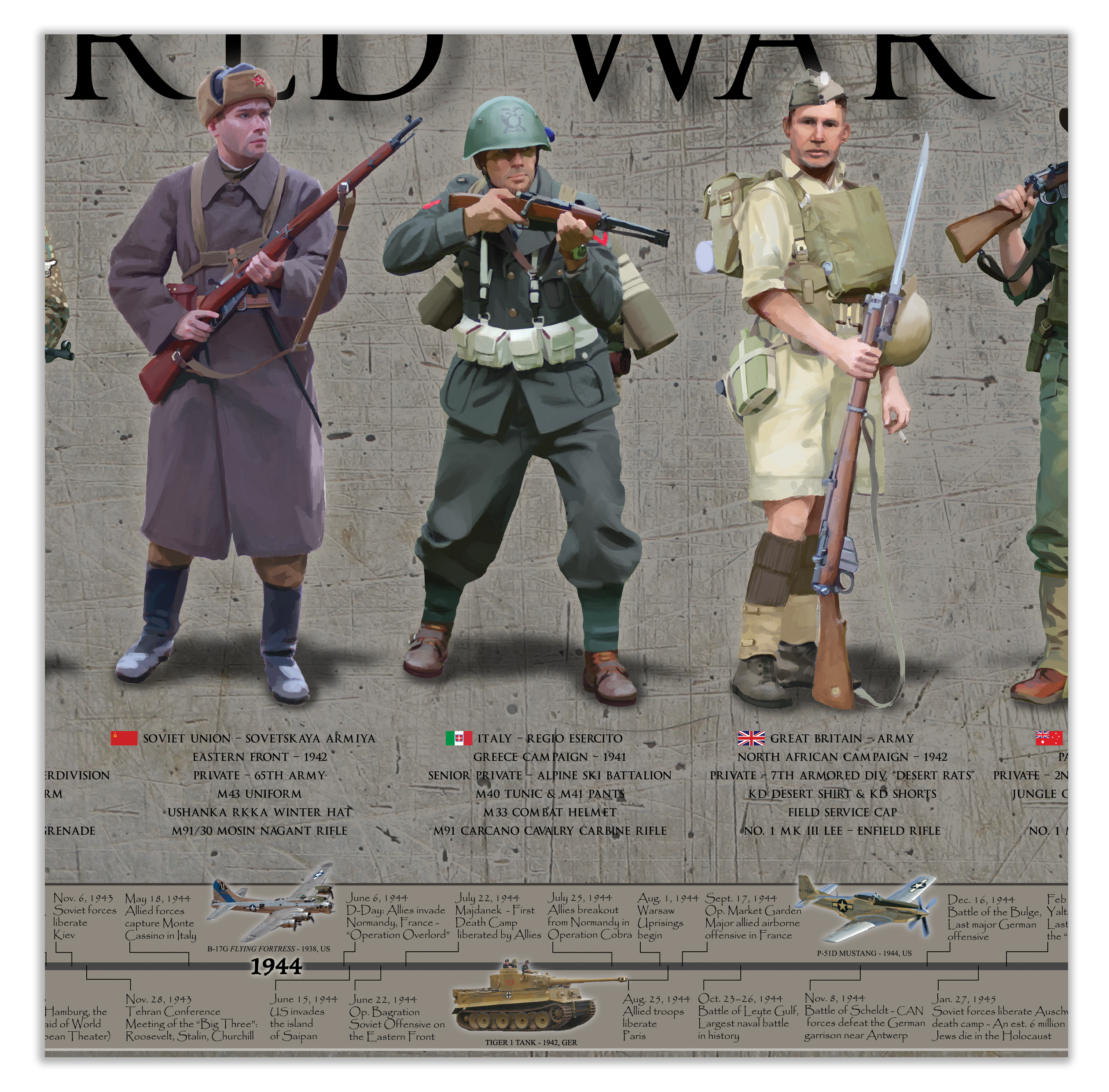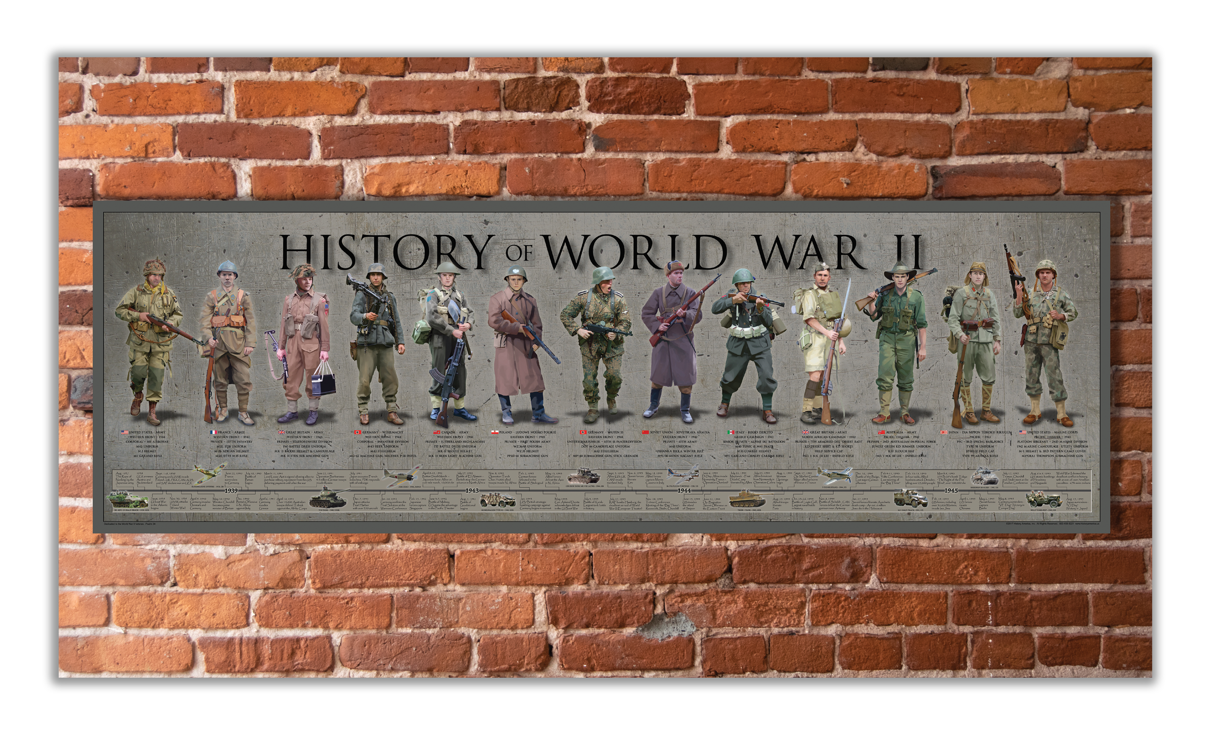 History of World War II - From the invasion of Poland to Japan’s surrender, learn about the world’s deadliest war. The thirteen soldiers represent ten countries, including: the United States, France, Great Britain, Germany, Canada, Poland, the Soviet Union, Italy, Australia, and Japan. The 56-point timeline includes dates, facts, and twelve iconic land and air weapons.
